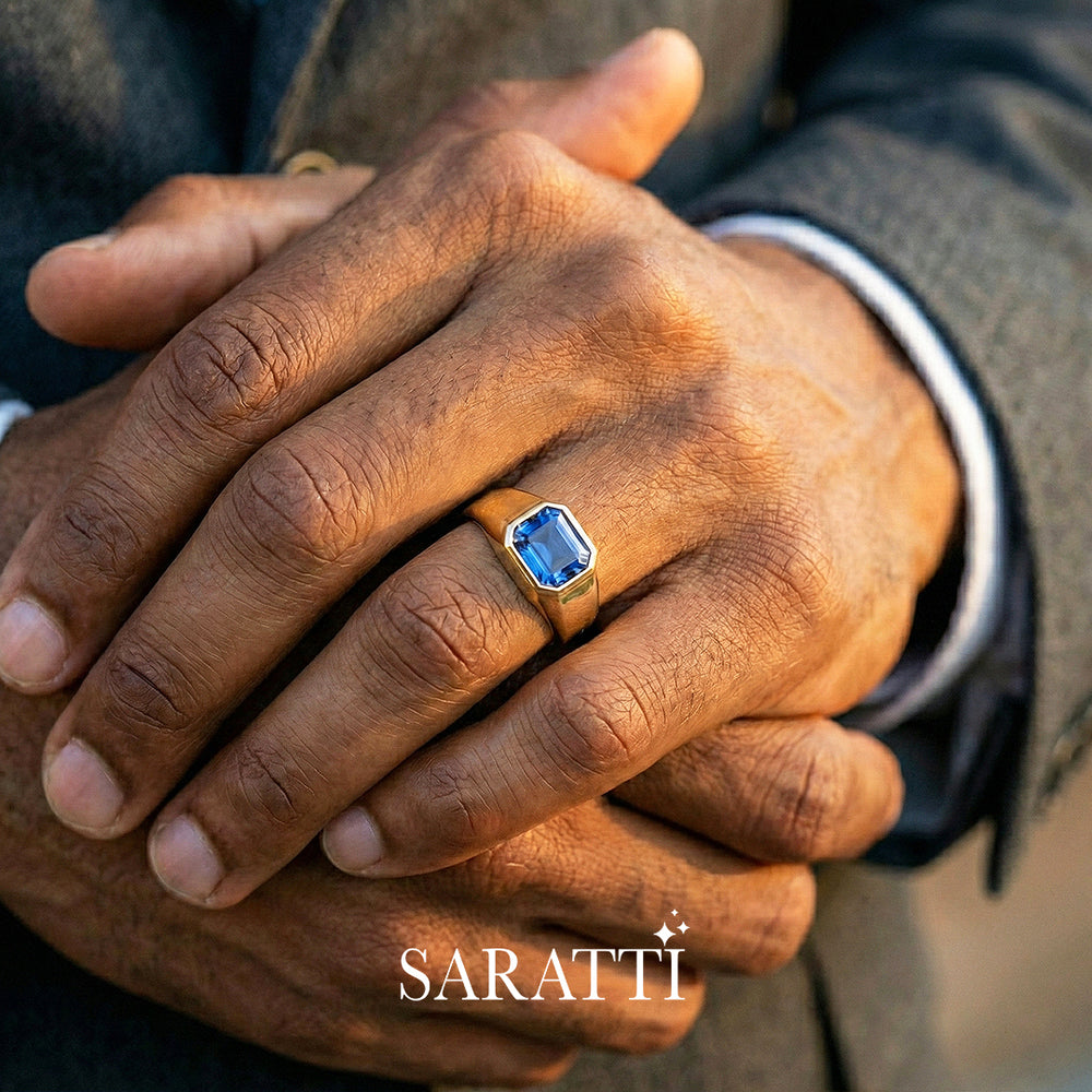 This deluxe Men’s Sapphire Wedding Band is the jewelry piece of your dreams. This ring features a Natural Sapphire as the center stone. It is set in gleaming 18K White Gold and weighs 3 carats. This creates a beautiful contrast for visual appeal. The sapphire is also bezel set for practicality and security. The interior is smooth for a comfortable fit as well.