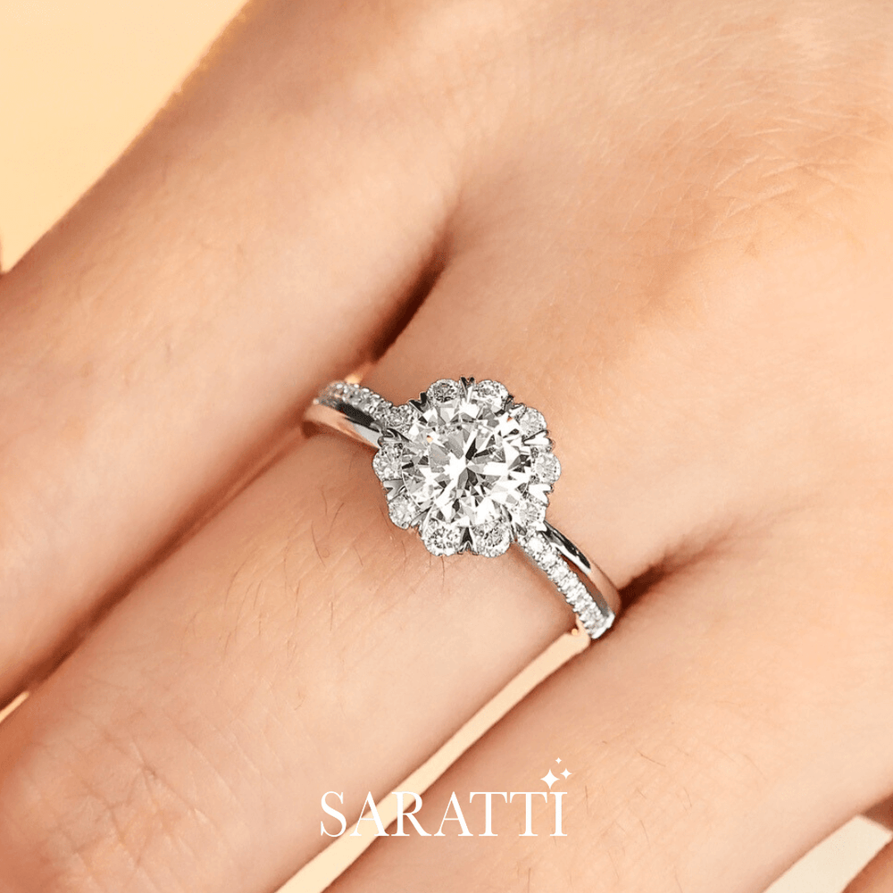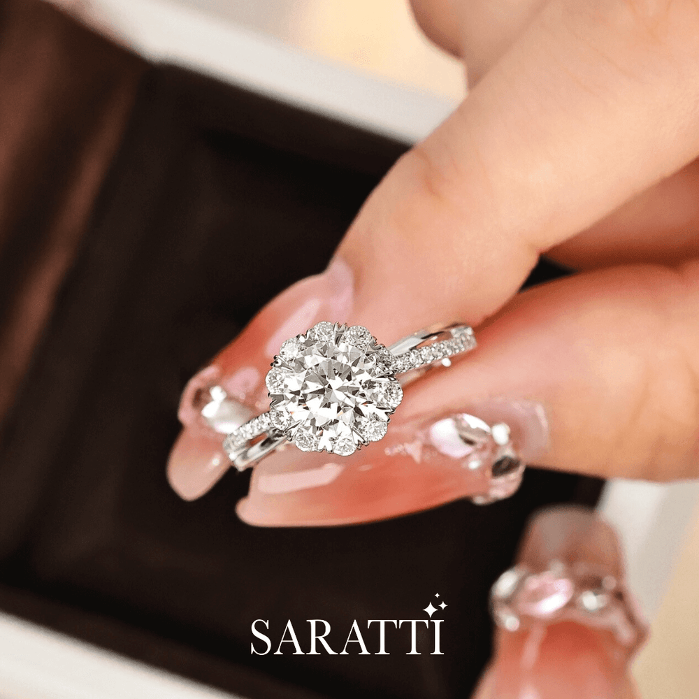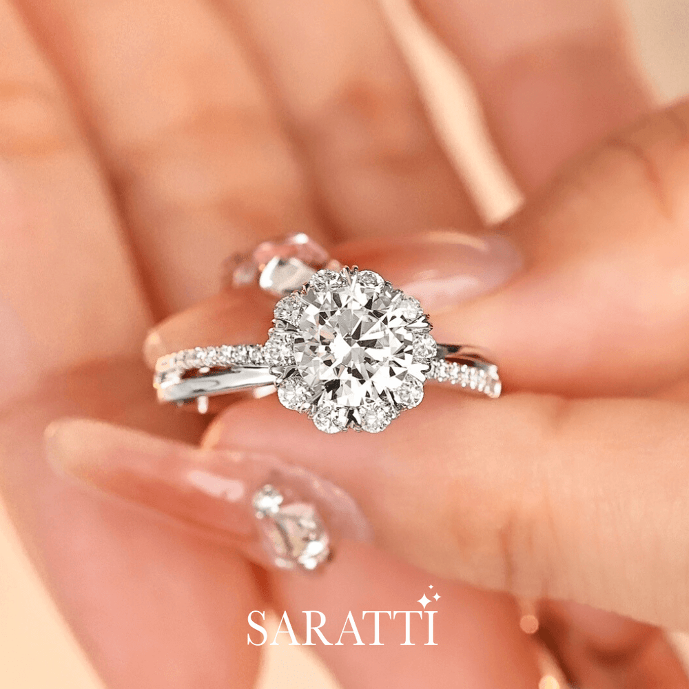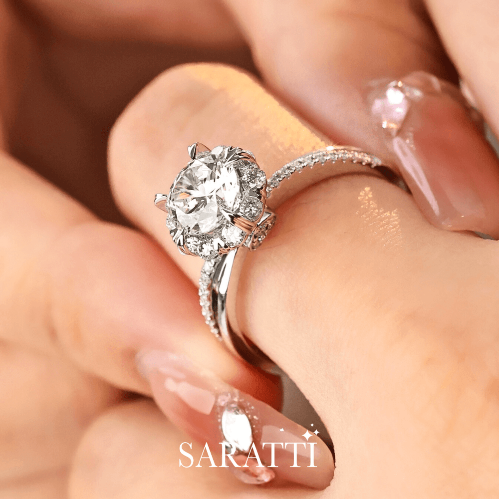 Crowning it all is a flower-inspired diamond halo, with a diamond-encrusted heart beneath the basket, whispering your love's lullaby for all the world to feel.