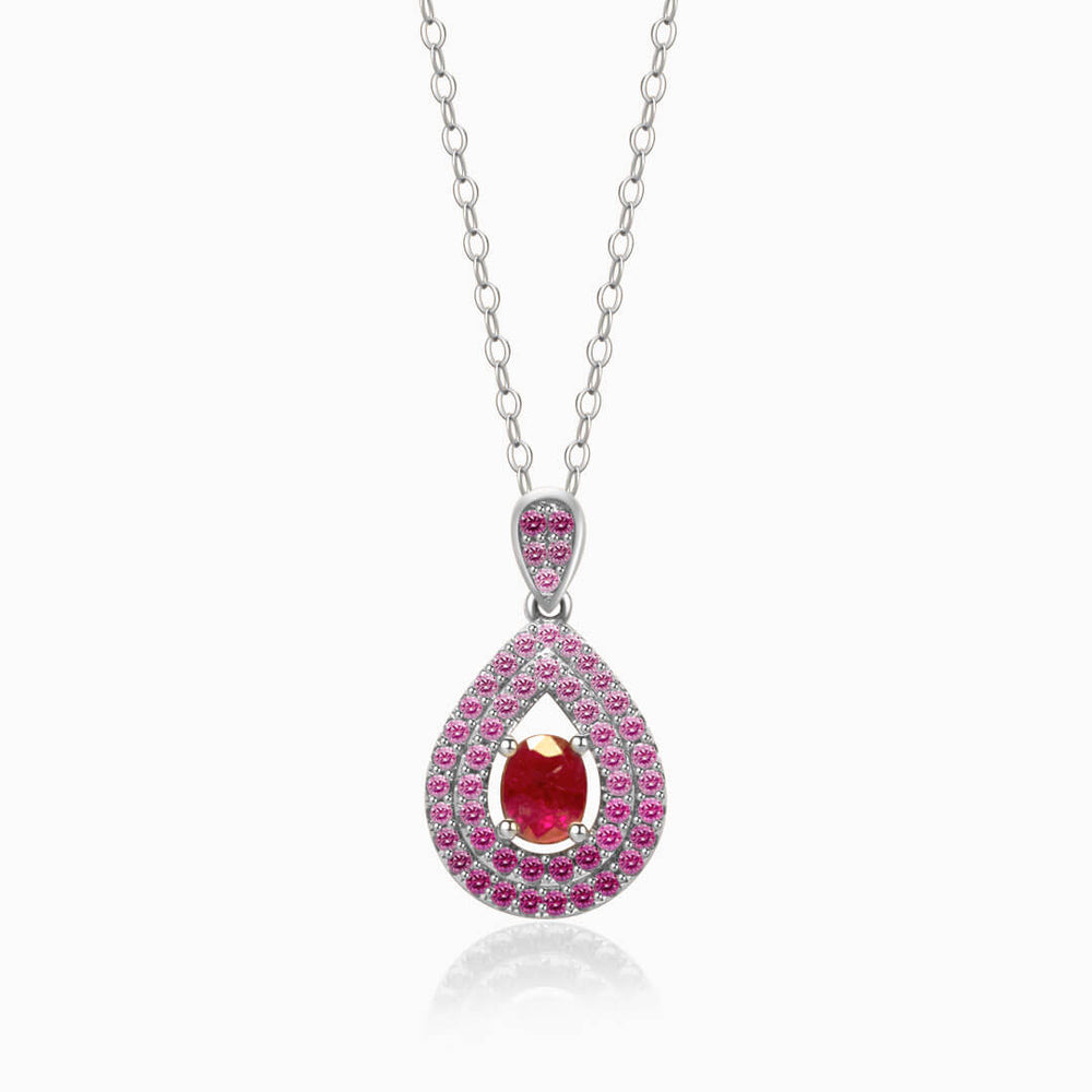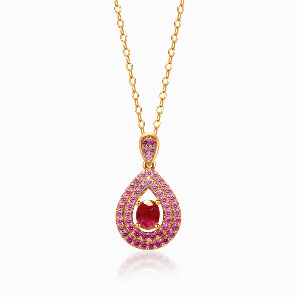 Experience the radiant, fiery beauty of rubies with the Mogok Rose necklace. At its center, a round cut ruby from the Mogok mines of Myammar burns bright in a yellow gold bezel setting. It weighs 0.50 carats. This center stone is encircled by concentric halos of pink sapphires, creating an ombre effect. The gradient of pink hues, from the light pink sapphires to the deep ruby focal point, greatly resembling a blooming rose. The teardrop shape of the pendant adds a touch to this modern design.