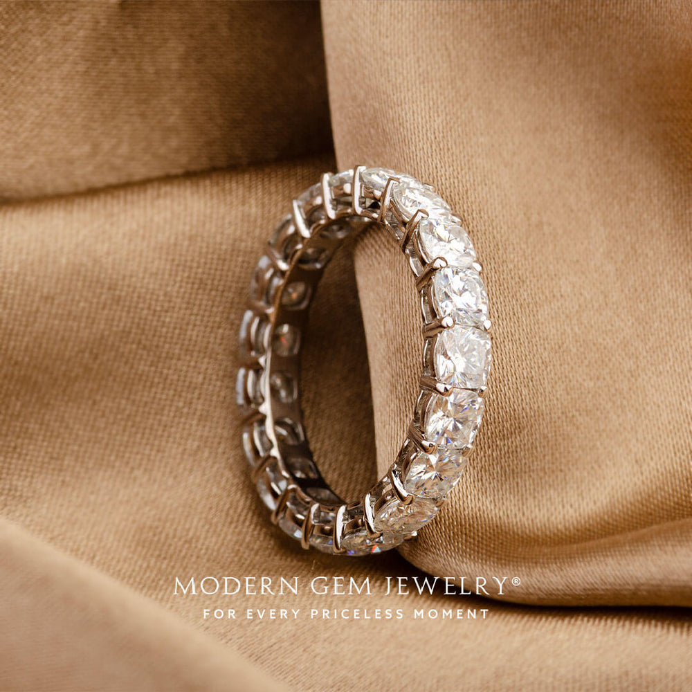 This lovely piece is handcrafted in 18K white gold. Its band gleams coolly, holding the gems in a sparkling circle. A classic setting cradles each cushion-cut diamond, wrapped in a continuous line. Four carats of natural diamonds sit along the band. This ring brings a touch of bold grace to every look, from wedding days to cherished anniversaries. It tells a story of lasting beauty and undying devotion.