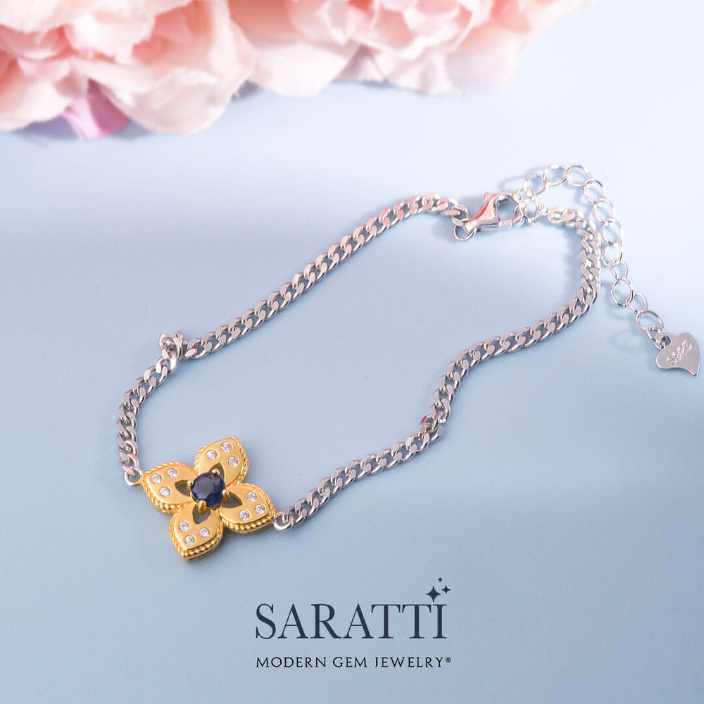 This intricate floral motif is handcrafted in a blend of 18K white and yellow gold, creating a visually striking two-tone effect. The delicate 18K white gold Cuban link chain lends a smooth, secure foundation for the captivating focal point. This blue Sapphire bracelet is versatile to be worn alone or stacked with other bracelets. The expert craftsmanship is evident in every aspect of this piece. From the two-tone metalwork to the precisely set gemstones, this bracelet is a testament to excellence.