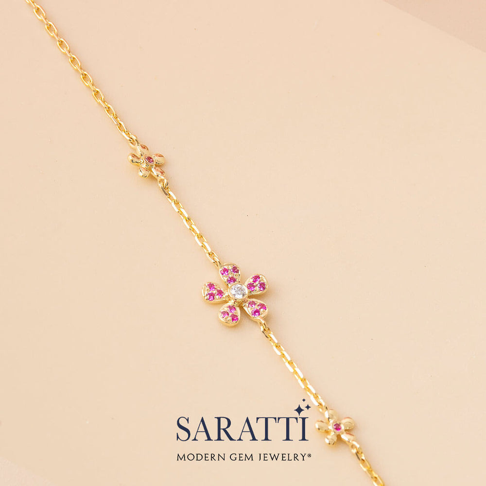 Radiant florals command attention with this captivating bracelet brimming with romantic charm. This piece is a harmony of lustrous gold and sparkling gem. A delicate flower motif is the centerpiece of this necklace, its petals made from vivid pink sapphires that appear to dance across the wrist. Twinkling diamond accents are nestled within this floral garland, their icy fire pairing well with the warm 18K yellow gold setting.