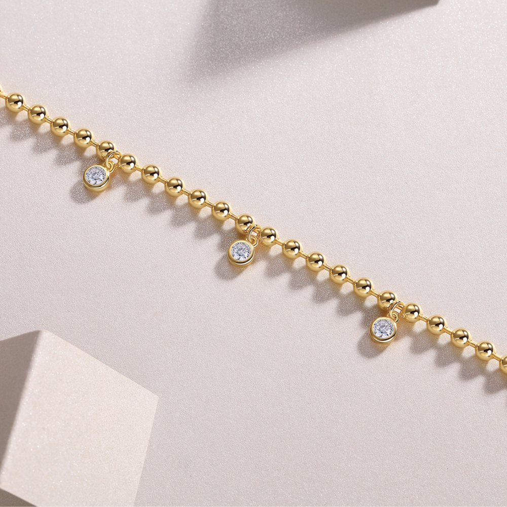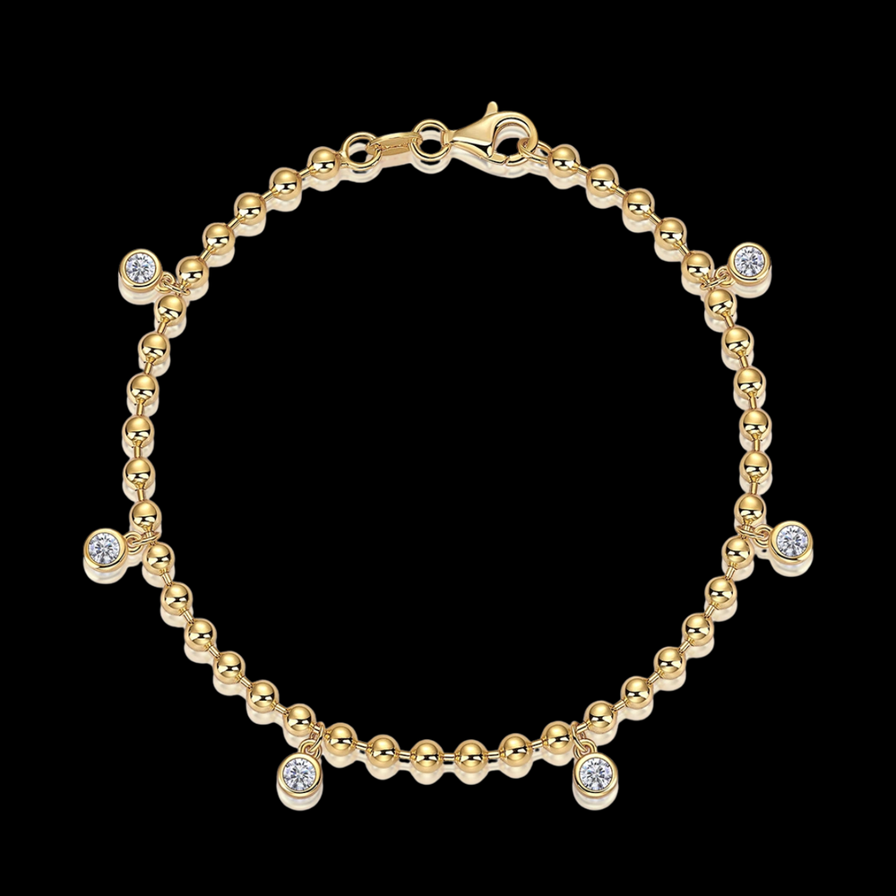 A symphony of precision-crafted golden spheres creates an intricate dance of light and texture in this extraordinary bracelet. Delicate moissanite droplets suspend like precious moments, catching and refracting light with an ethereal intensity that commands quiet admiration.