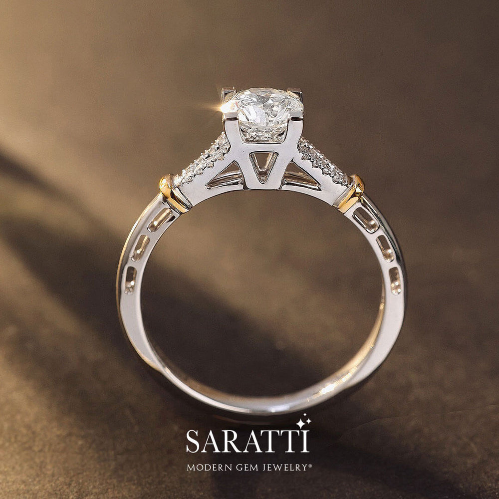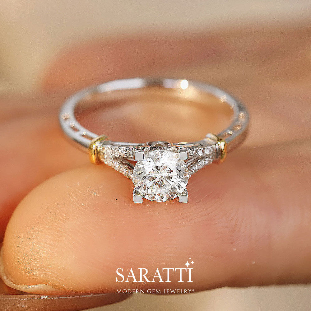 A 0.6-carat round brilliant diamond is held aloft by four prongs at the heart of this piece. The prongs secure the diamond while allowing it to take center stage. The split shank is encrusted with 0.2 carats of carefully set smaller diamonds. They go down each side of the center stone. This setting creates a sense of continuous shimmer as light dances across its surface.