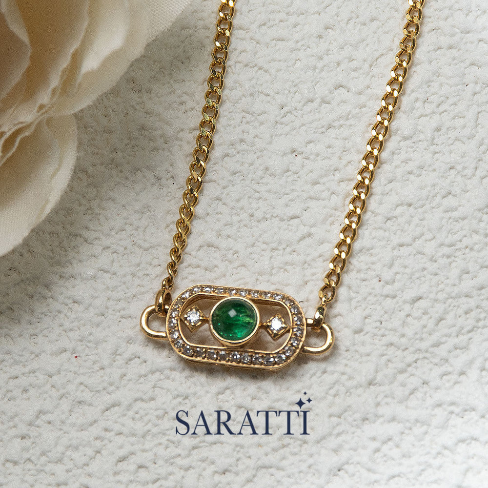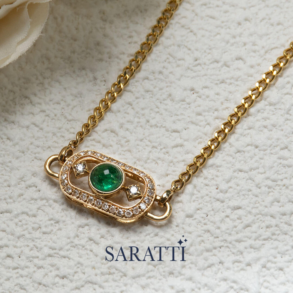 This Saratti creation is simply mystifying. With an elegant oval frame centerpiece handmade in 18K yellow gold, this has a deep antique inspiration. At the center is a 0.40 natural emerald, round and expertly bezel set with a mesmerizing lush green hue. The emerald is flanked by two round diamonds, each prong set, adding more sparkle and depth to the overall design. The border surrounding the oval frame is adorned with pave set diamond accents which weigh a total of 0.18 carats.