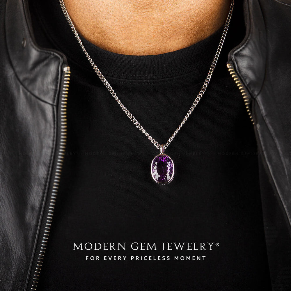 The name "Occulus Regis," meaning "Eye of the King" in Latin, perfectly captures the pendant's commanding presence. The amethyst's substantial size and superior clarity create a mesmerizing play of light, with flashes of lavender, violet, and deep purple dancing within its facets. The smooth, contemporary bezel setting provides a sleek frame that doesn't detract from the gem's natural splendor.