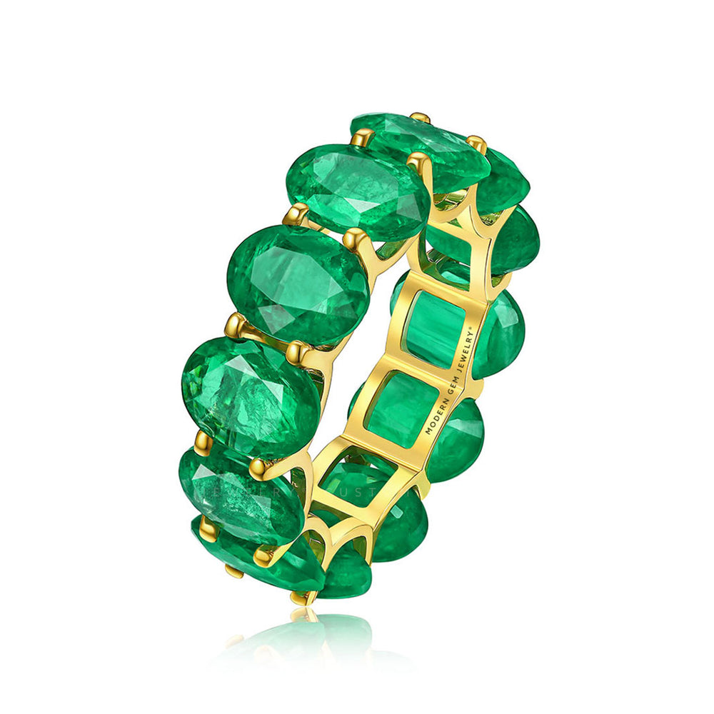 This ring captures the true essence of an emerald forest surrounding your finger. This piece of jewelry does exactly just that. With a stunning array of oval-cut emeralds set in 18K yellow gold, it showcases a unique cascade design that allows each emerald to stand out. Unlike traditional eternity bands, it creates a green river that flows endlessly around your finger.