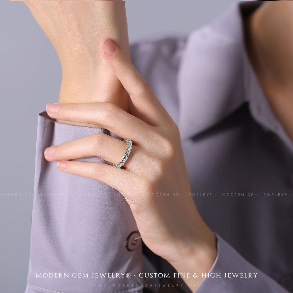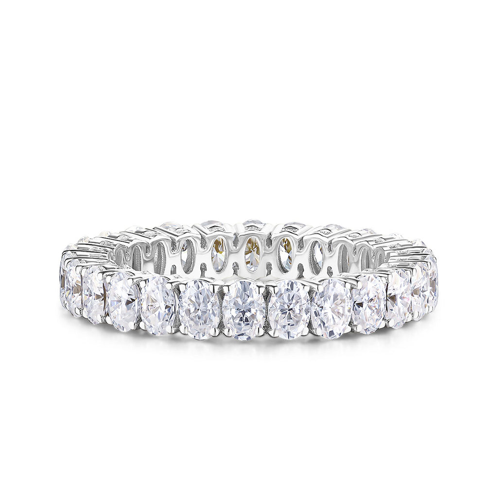 This ring is handcrafted in 18K white gold, with the gems in a dazzling row. A prong setting cradles each oval diamond, wrapped in a secure embrace. A brilliant 2.8 carats of natural diamonds sit along the band. This ring brings a touch of modern grace to every look, from grand weddings to nights on the town. It tells a story of blossoming beauty and elegant commitment.