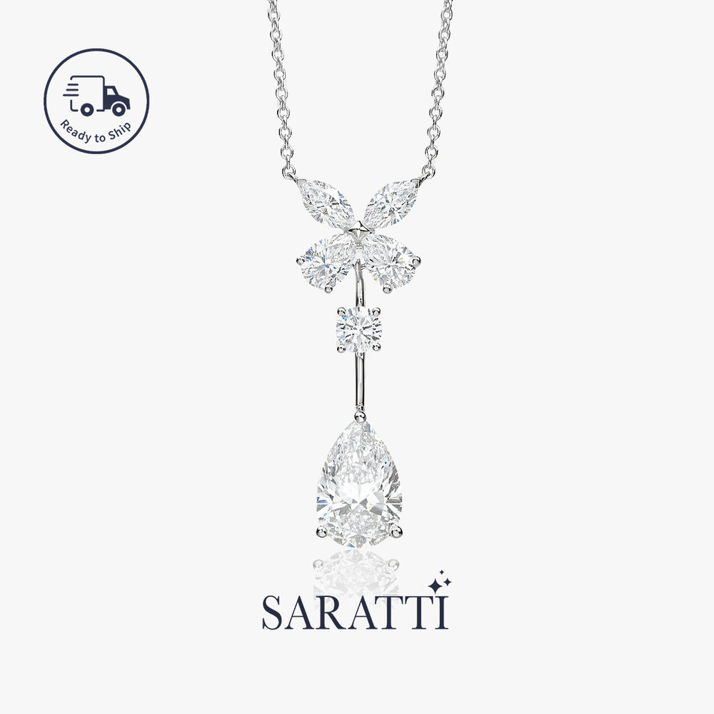 Petale de Lumière is inspired by the softness of a dew-touched petal — that fleeting moment when light rests gently before falling. The marquise petals form a delicate bloom, while the pear diamond drops like a bead of pure luminance.
