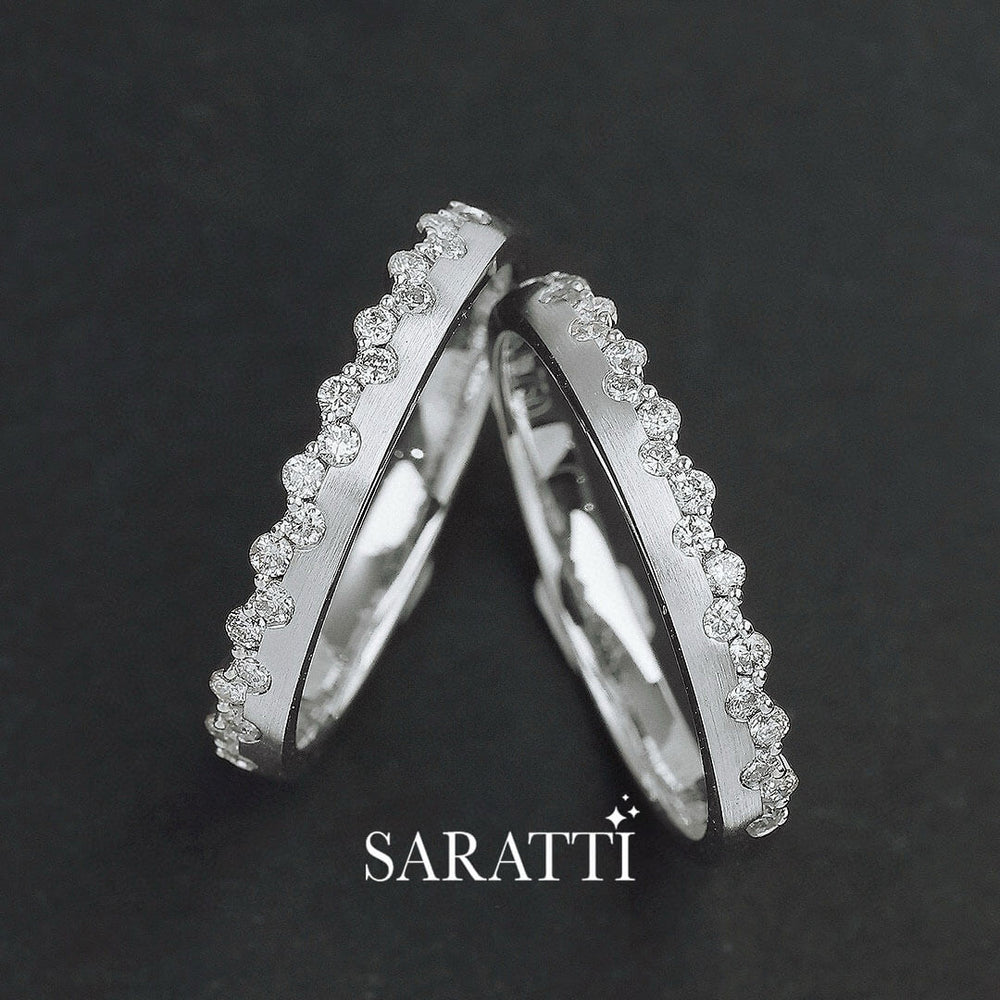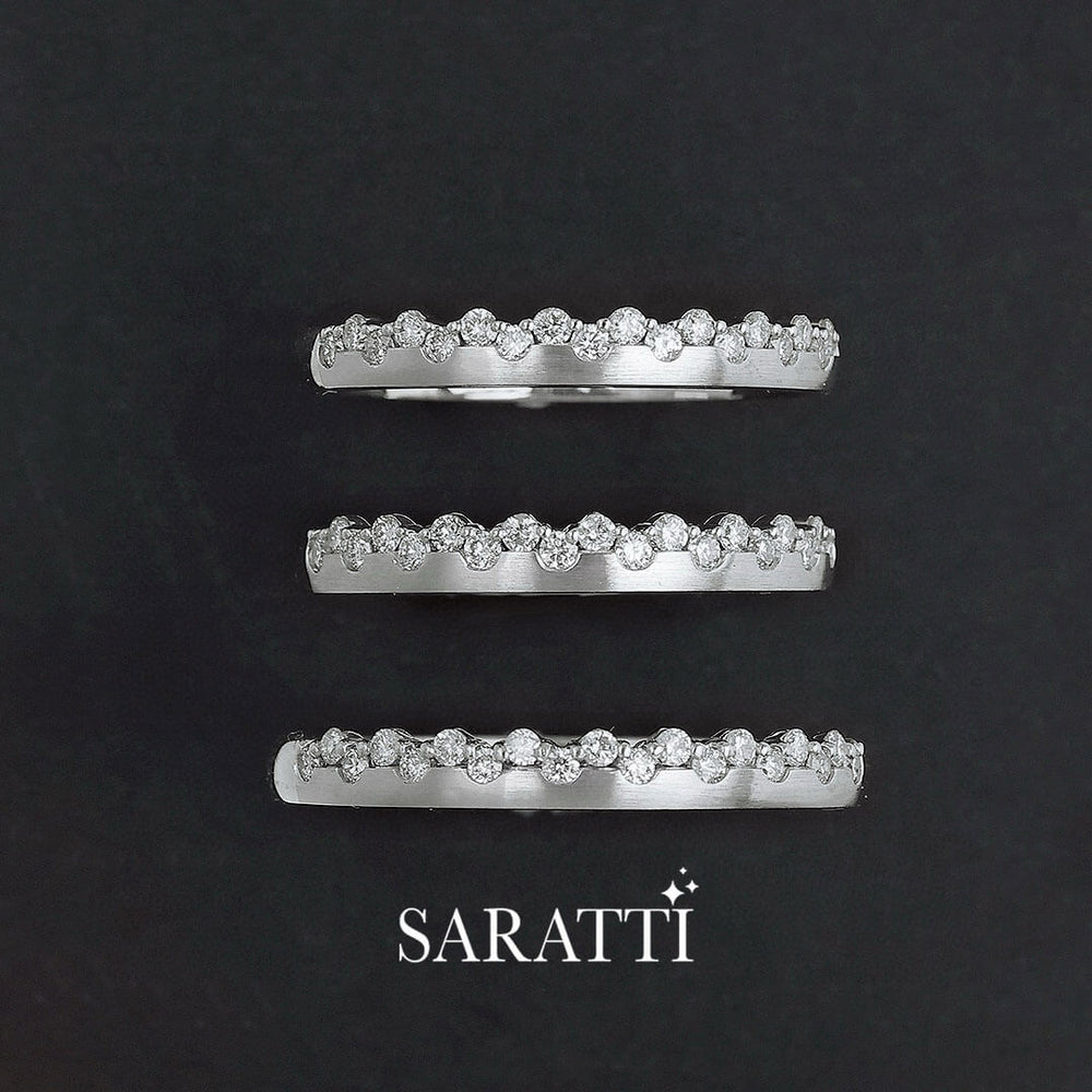 The Tiara Inspired Diamond Eternity Wedding Band - a witness to regal beauty. Its band is handcrafted meticulously. Its design curves like a delicate tiara, holding gems in a royal embrace. Small settings lift each natural diamond high, creating a circle of light. Ethically sourced diamonds sit all around. Their sparkle telling a story of precious beauty in 18K Gold.