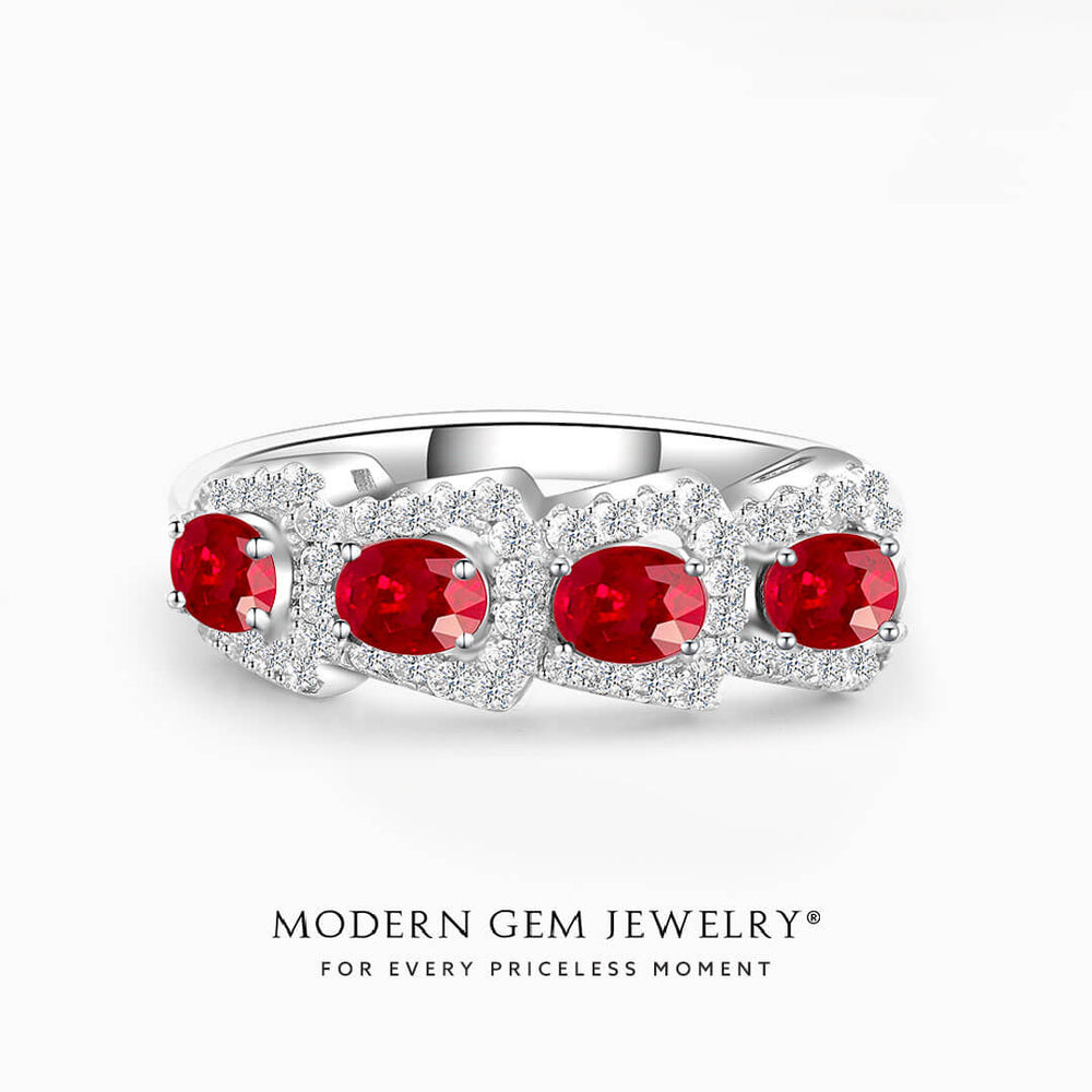 This ring is brilliantly handcrafted in 18K white gold. Its band gleams with four oval rubies, each hugged by diamond halos. Prong settings lift each gem high, creating a circle of sparkle.