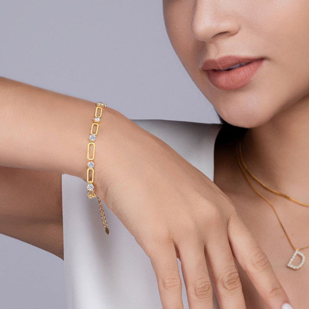 Ingeniously crafted elongated links create a mesmerizing architectural rhythm in this extraordinary bracelet. Moissanite stones nestle between golden links like perfectly placed celestial markers, transforming each connection into a moment of sparkling dialogue.