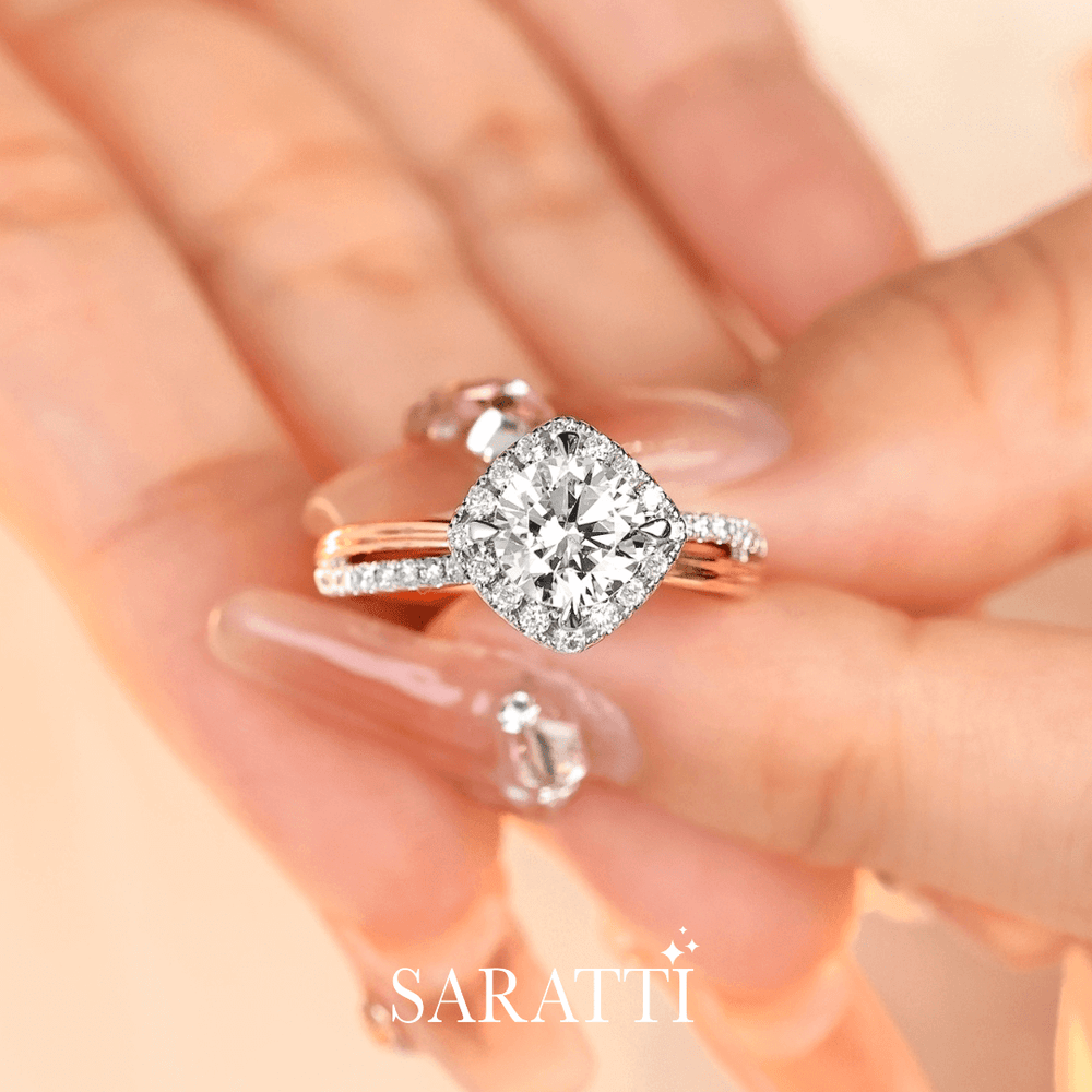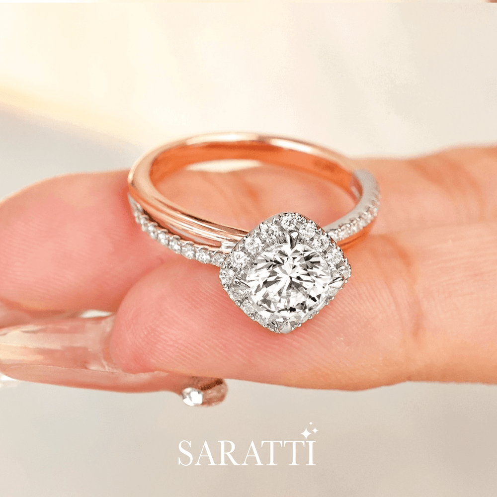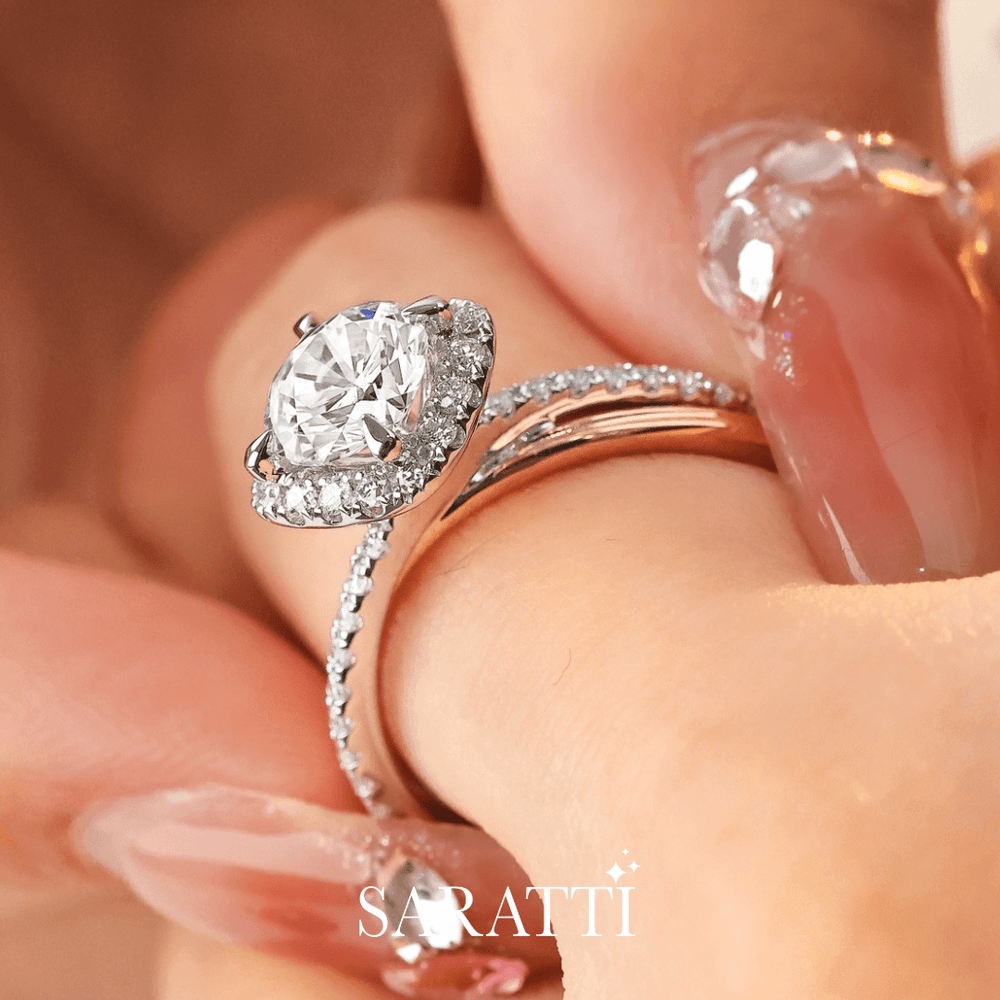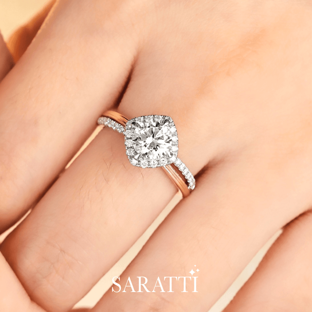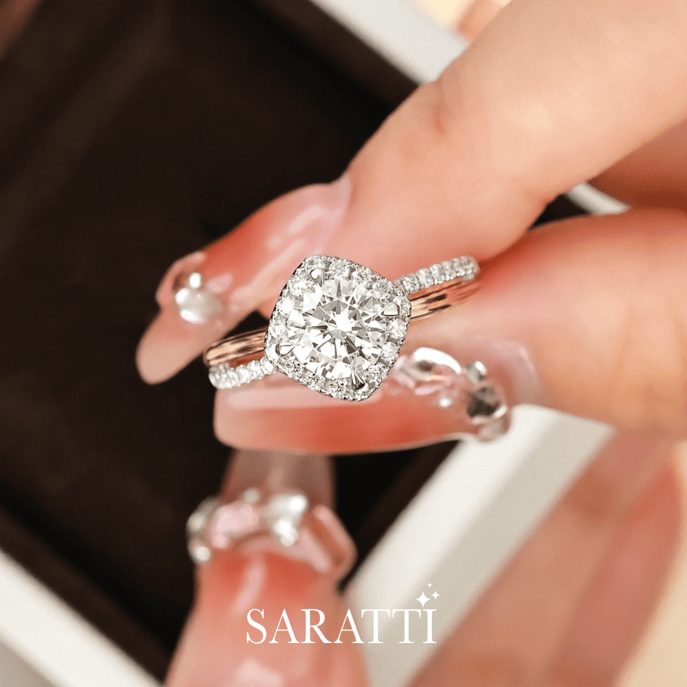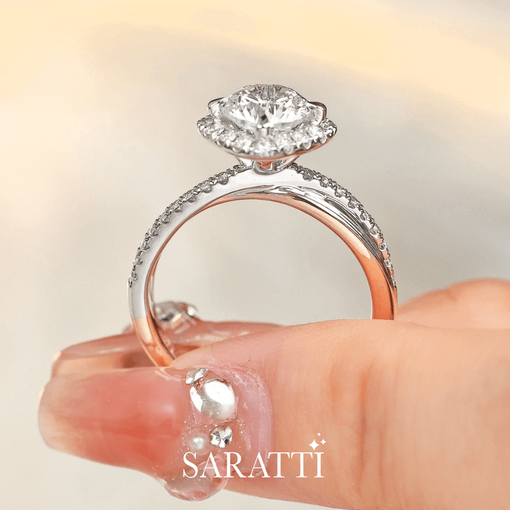 Renea is expertly fashioned in 18K two-tone gold. Her sleek white gold band carries a single row of pavé diamonds, a path to brilliance. Four rose gold claws rise like gentle guards shielding the center stone. A 1 carat natural diamond stands at the heart of this dual-toned beauty. Embracing it, a halo of diamonds forms a sparkling court, while a diamond-encrusted cathedral setting supports it like pillars of devotion.
