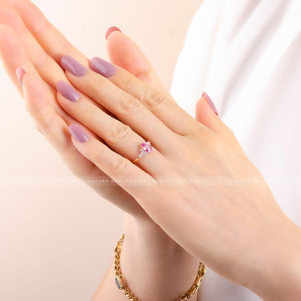 The true beauty of the sapphire is its spectrum of color and this ring is no exception. This ring is dainty and bold in a very unique, exciting way. It showcases an oval sweet pink natural sapphire. The stone is flanked by carefully selected round diamonds creating a unique appeal and style.