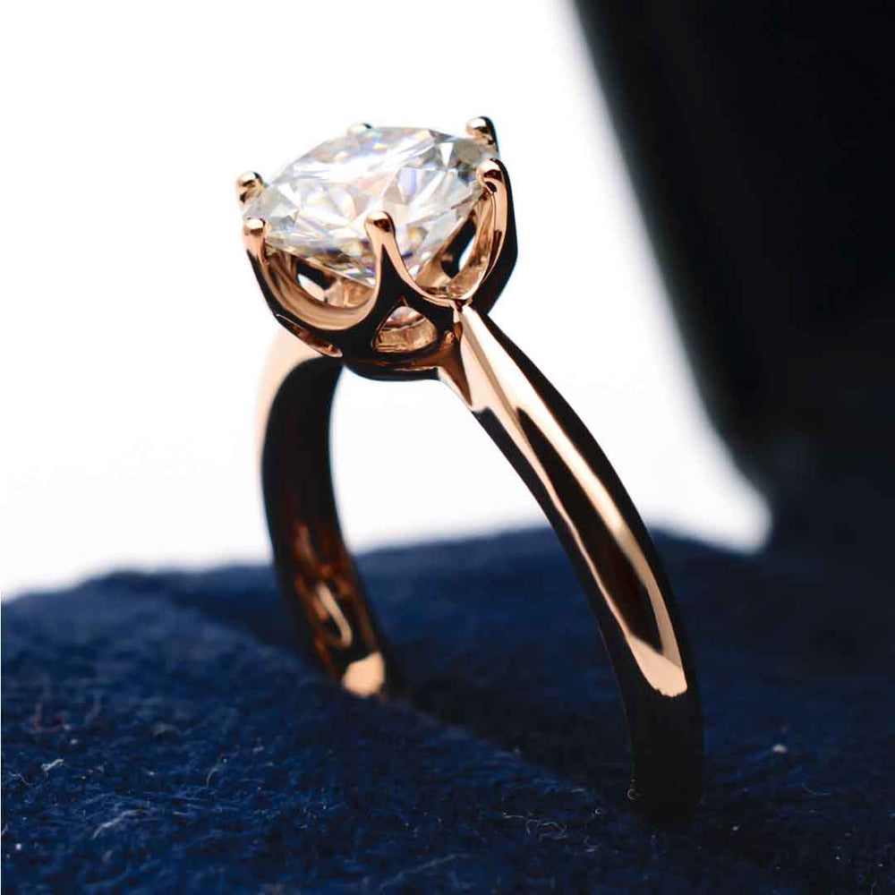 Introducing Rosie, a rose gold moissanite dream. She is an embodiment of feminine glow in modern romance. At her heart is a dazzling 2 carat round moissanite, its brilliance enhanced by the rosy metal hue. She showcases an innovative, sculptural prong setting. Six curved prongs rise from the band, creating a crown like bed for the center stone.