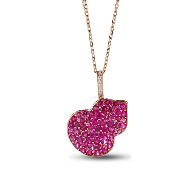 Are you looking for a statement piece that combines luxury with whimsy? This stunning ruby pendant necklace features 1.85 carats of deep natural rubies complemented by 0.03 carats of sparkling diamonds. All of this goodness is set in beautiful 18K Rose gold that brings warmth and sophistication to any outfit or occasion.