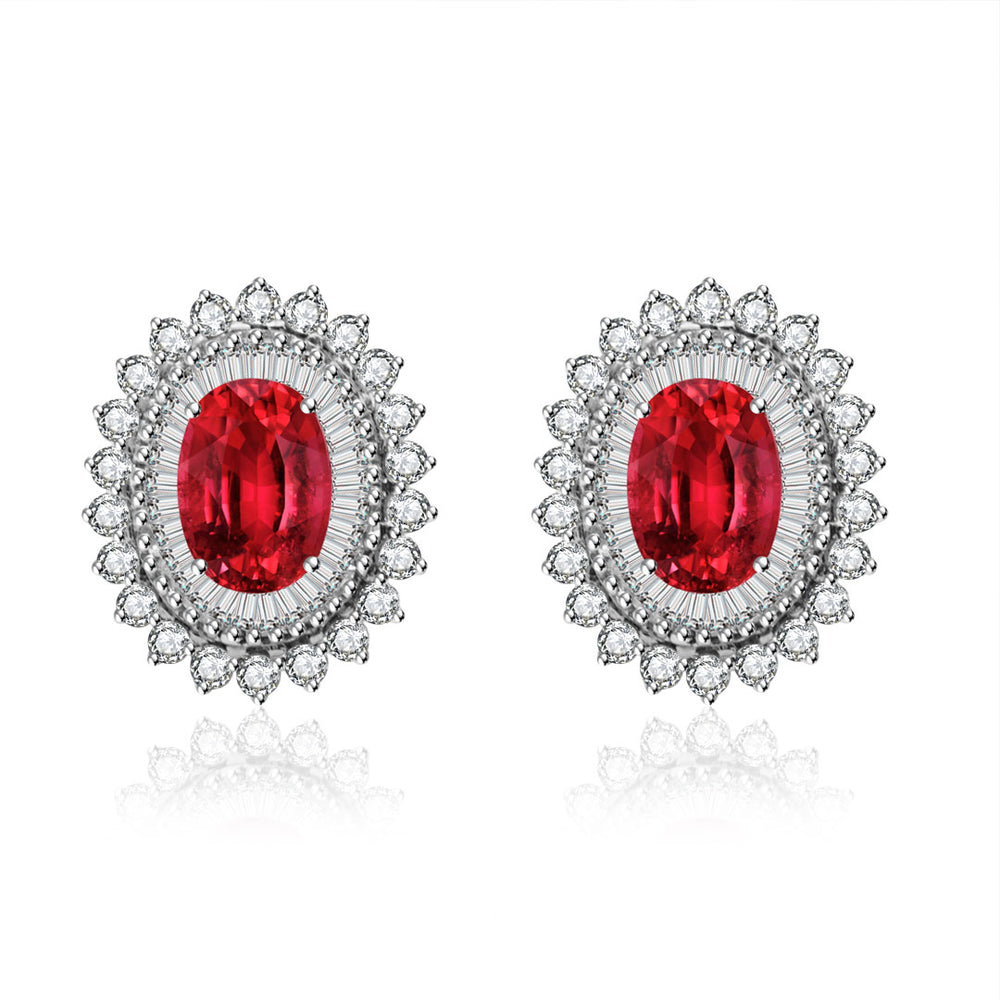 The rubies are surrounded by a halo of sparkling diamonds, meticulously arranged to increase brilliance. The inner halo features T-shaped diamonds, their lines providing a contrast to the rich rubies. The outer halo showcases round diamonds, adding a soft edge that completes the vintage-inspired charm. The result is a pair of earrings that demand attention with their radiant and exquisite beauty.