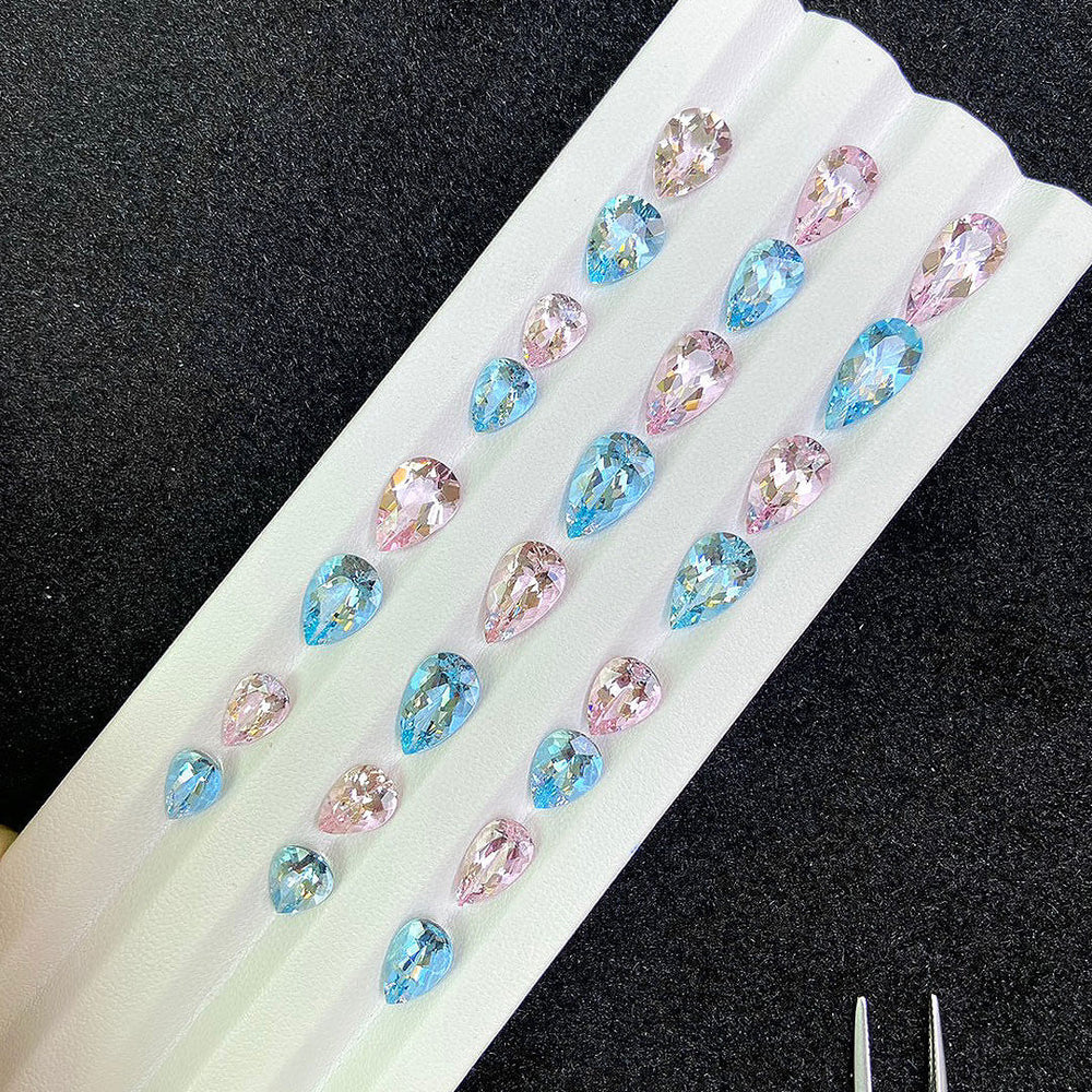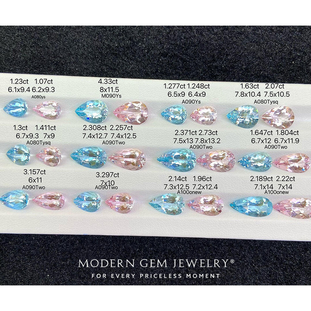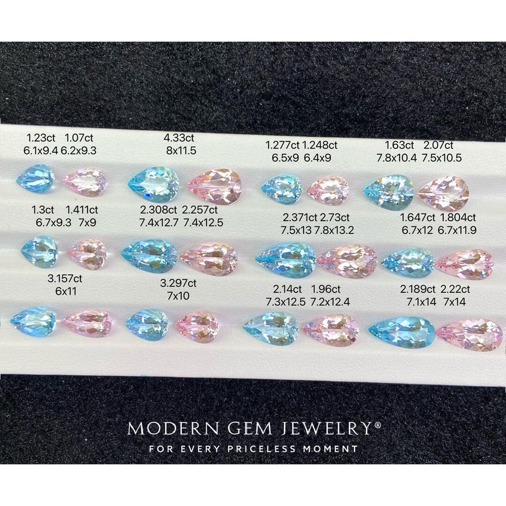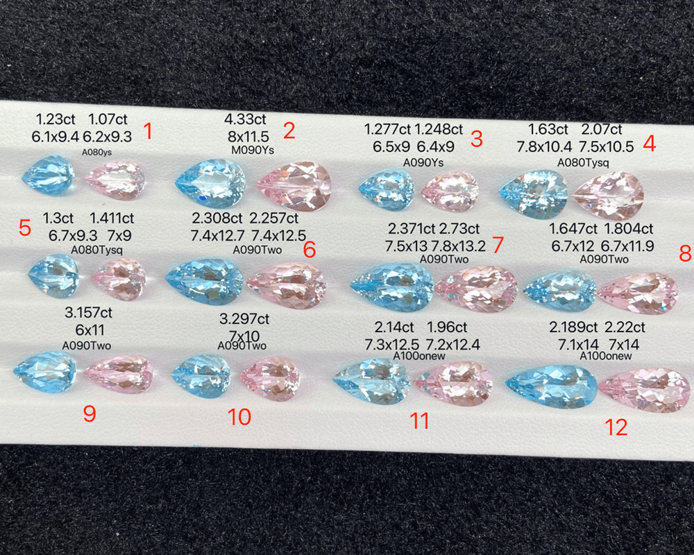 Their pink cousins, the vivid morganites have a warm yet captivating charm. The pear-cut silhouette of these gemstones increases their charm, offering a perfect fusion of classic and modern design possibilities. With weights ranging from 1 to 4 carats and boasting eye-clean clarity, these matched sets present many possibilities for creating bespoke jewelry pieces that are extraordinary.