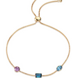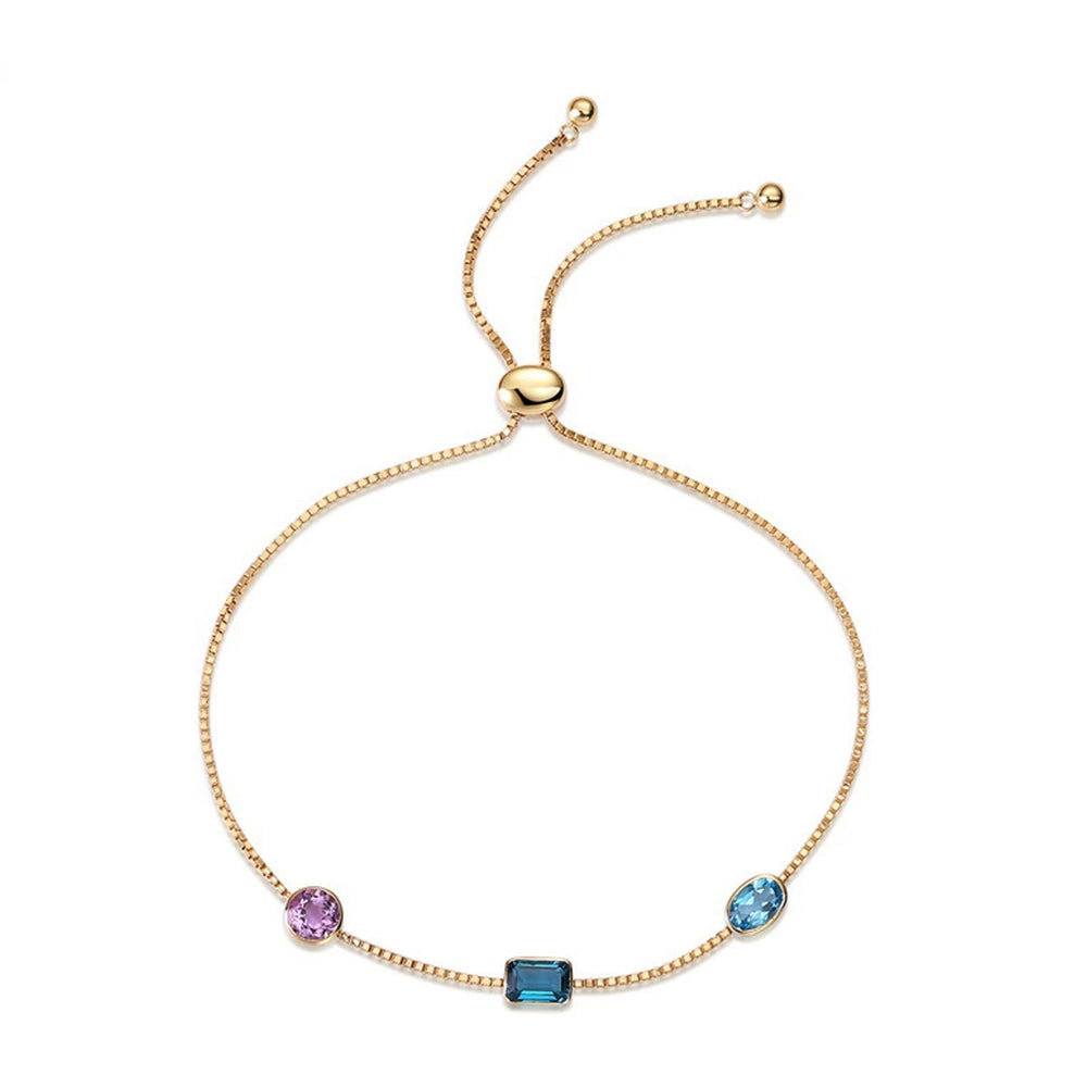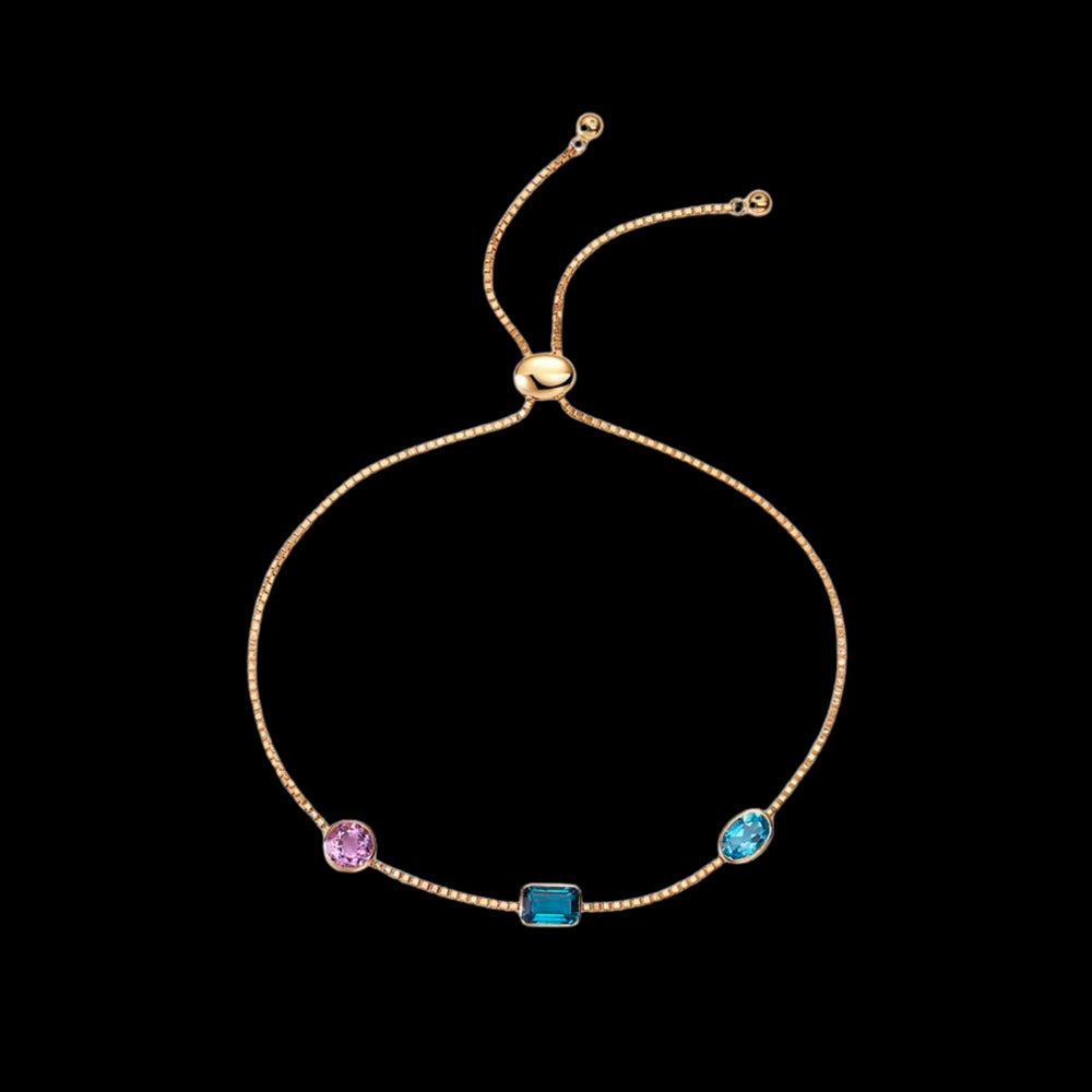 A delicate golden thread weaves between vibrant gemstones, creating a bracelet that captures the essence of understated luxury. Emerald-cut London blue topaz and round pink amethyst create a chromatic dialogue, suspended on a refined adjustable chain. Each stone is meticulously selected to offer maximum color depth and brilliance. The bolo-style design ensures a perfect fit for every wrist.