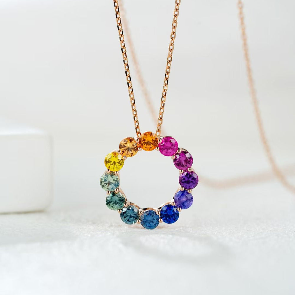 A captivating circle of multicolored natural sapphires dances along this 18K rose gold pendant with each stone secured by delicate prongs. This setting allows for ultimate light penetration and performance.