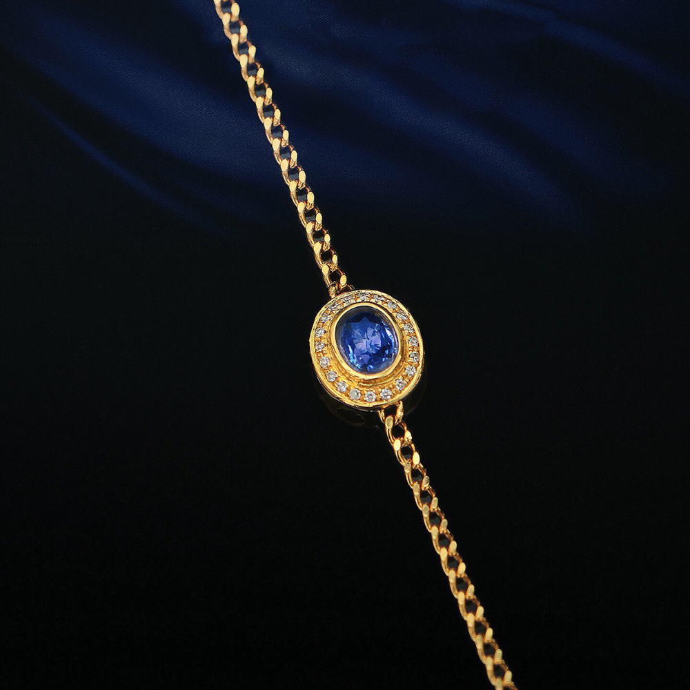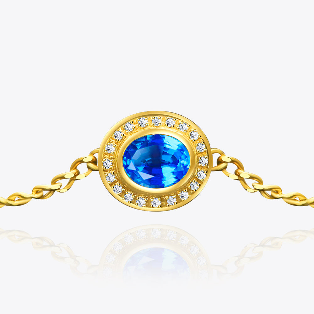Crafted as a whisper of elegance, the Stellar Grace bracelet presents a vivid 0.5ct natural sapphire, haloed by a constellation of brilliant diamonds. Its oval setting, encased in luminous 18K gold, radiates timeless sophistication. Light yet luxurious, it drapes with effortless grace upon the wrist, offering versatility from everyday refinement to celebratory moments. A jewel of serenity and strength, it is more than adornment — it is a symbol of poise, devotion, and enduring beauty.