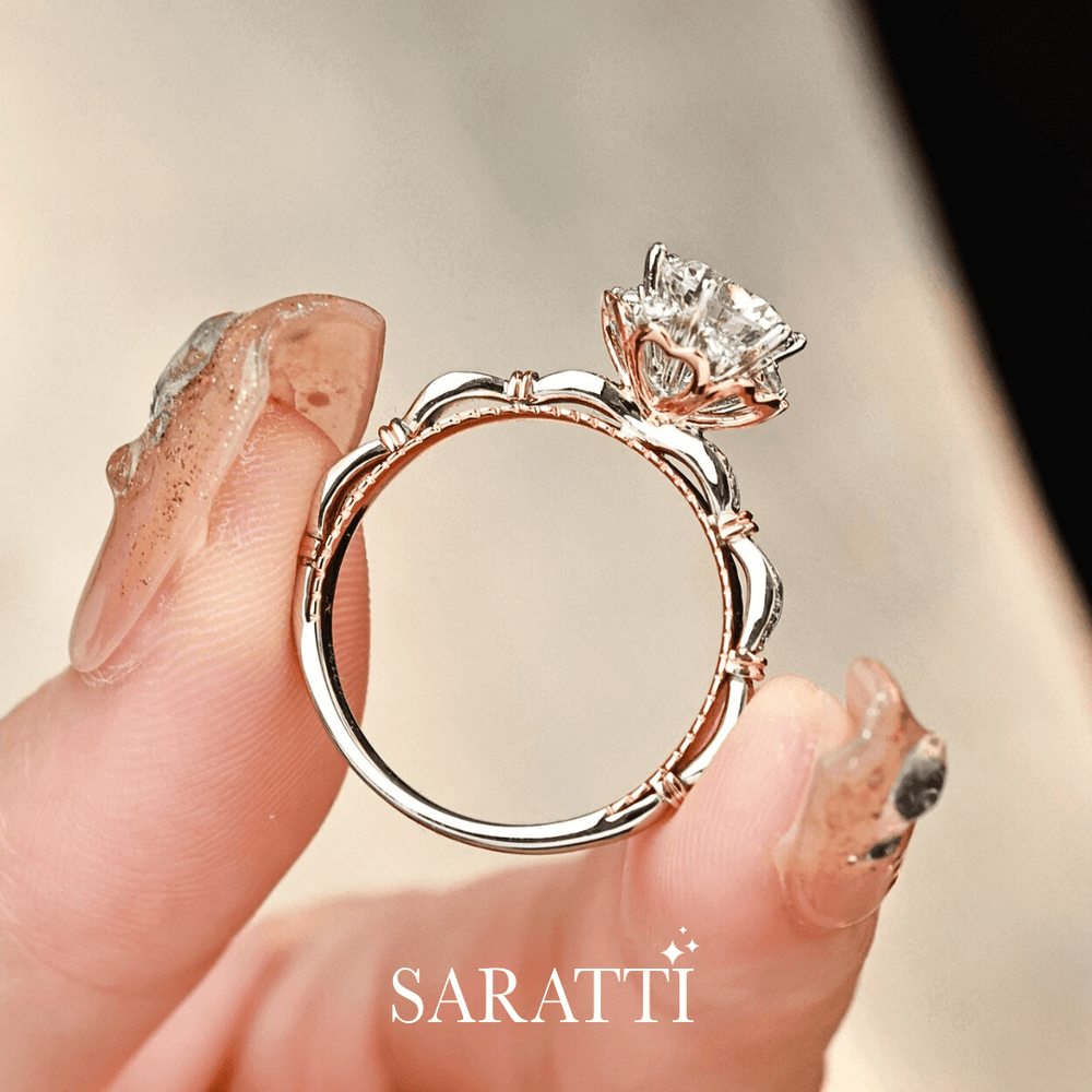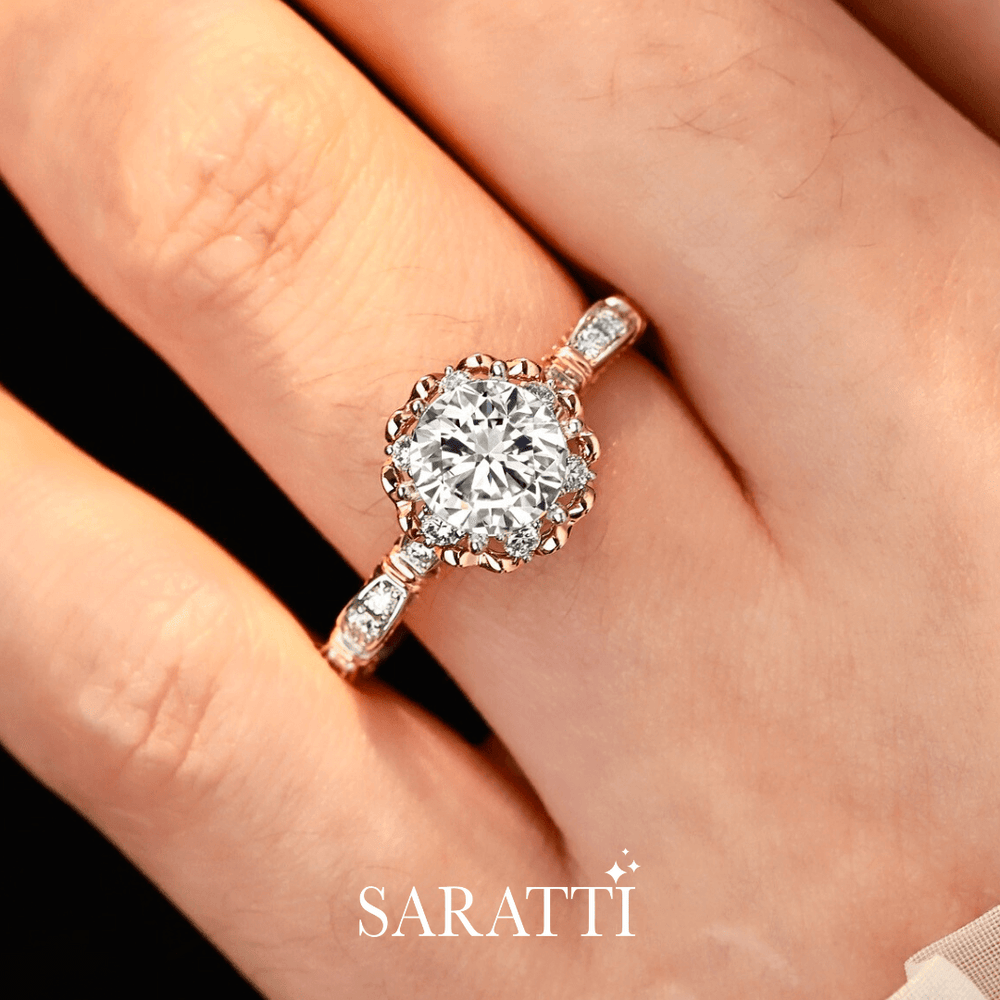 Suki is wonderfully handcrafted in 18K White and Rose Gold. She features a two-tone band adorned with milgrain detail and diamond pavé. This six-pronged wonder also boasts a heart flower petal on the basket and diamond halo. A perfect blend for the ultimate vintage effect. A 1 carat natural diamond blazes at the core of this romantic beauty.