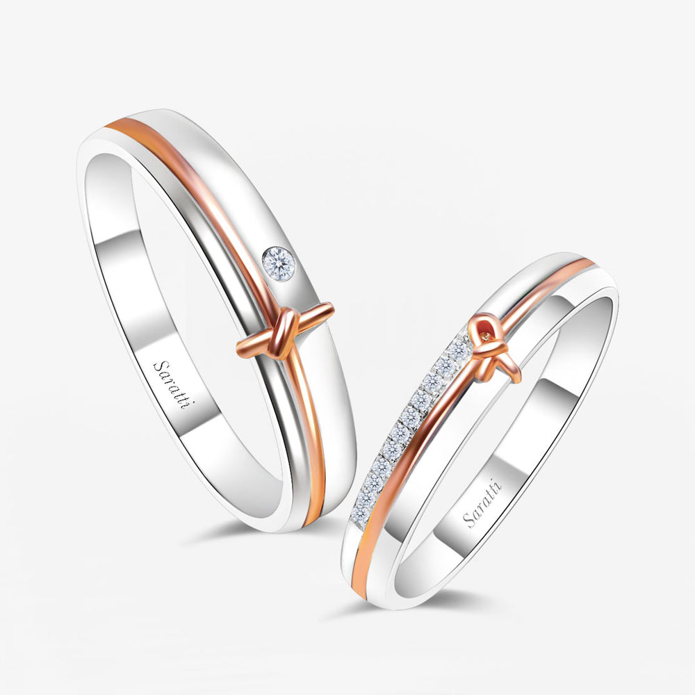 Picture delicate ribbons of 18K rose gold wrapped adoringly around bands of white gold, creating a dance of warm and cool tones that catch every eye. Each ring showcases a charming rose gold bow at its core- a loving symbol of being tied together. The feminine band shines with a stream of natural diamonds nestled along one end, adding a magical touch to the design, while its twin keeps the same graceful bow motif in a more subtle style.