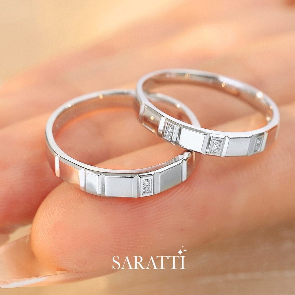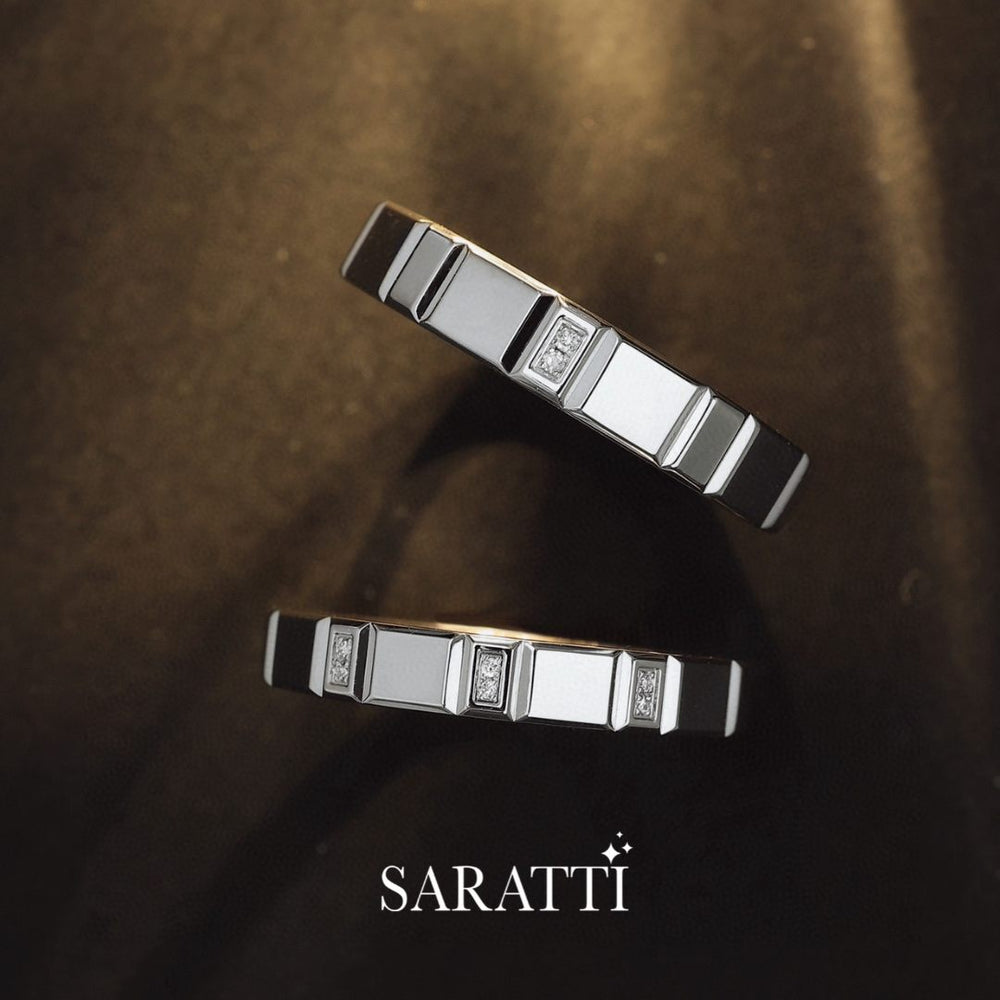 Welcome to the future of romance. The Midnight Cityscape Wedding Ring Set is a stunning fusion of urban refinement and heartfelt devotion. These handcrafted 18K white gold bands feature alternating rectangular segments. They create a stunning pattern which resembles city lights twinkling against a night sky. Watch as natural diamonds catch light from their secure bezel settings. These accents are positioned artfully within select segments to create a beautiful rhythm of shine and sparkle.