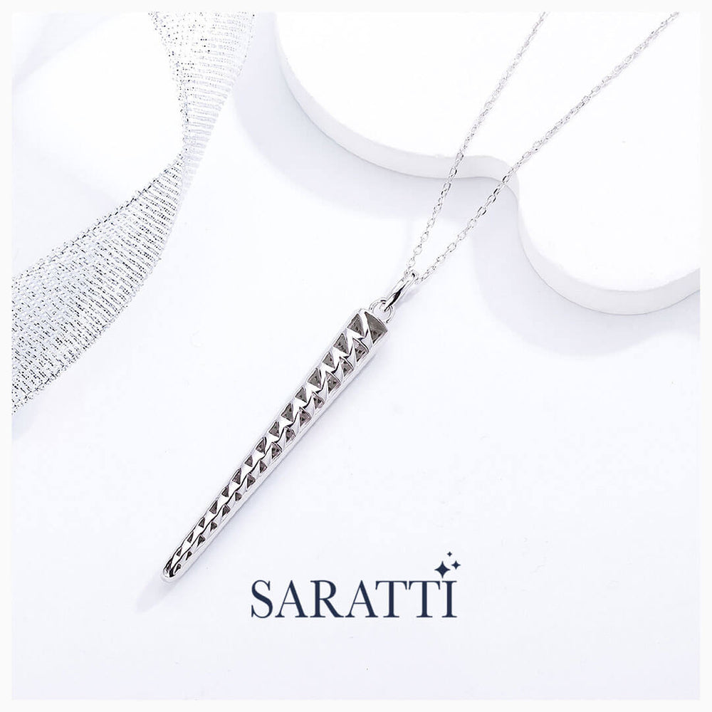 At the heart of this piece is an elongated spike pendant, crafted in 18K white gold and adorned with numerous pave set natural diamonds. The unique tapered shape starts wider at the top and narrows to a delicate point, creating a dramatic movement. The entire surface is studded with natural diamond stones which weigh a total of 0.65 carats which reflects light from every angle.