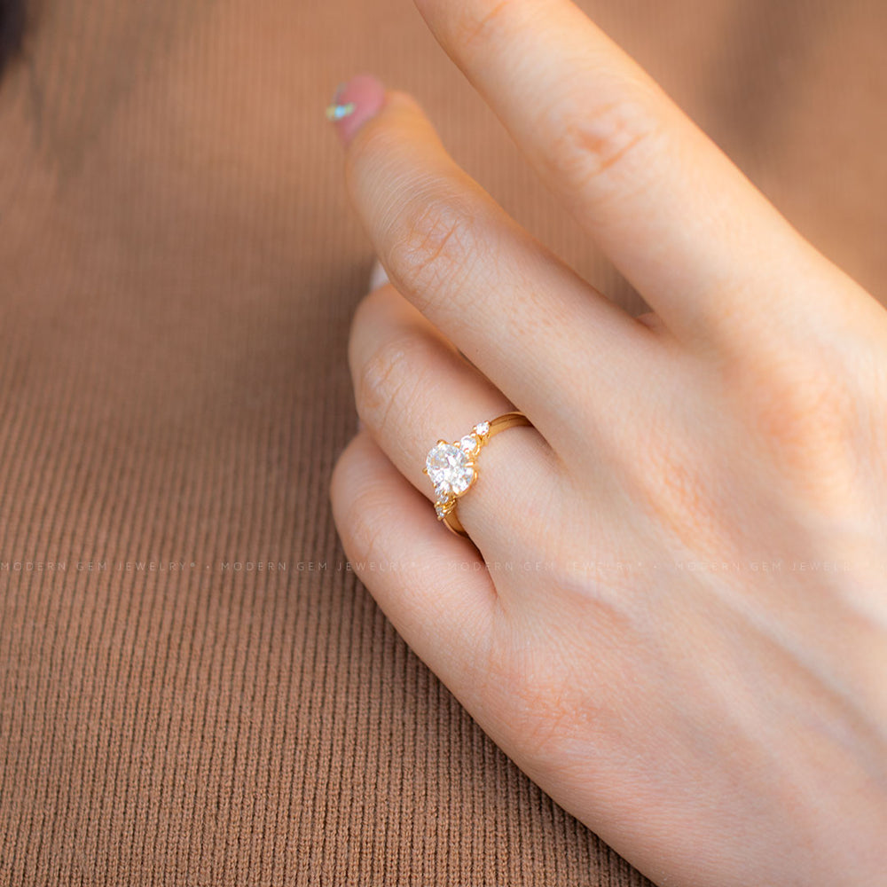A romantic reinterpretation of the classic three-stone ring, centered around an oval moissanite elevated in a sculptural prong setting. Flowing lines and petal-inspired details give the design a soft, organic character, while cascading side stones add gentle brilliance. The result is a piece that feels both timeless and quietly distinctive.