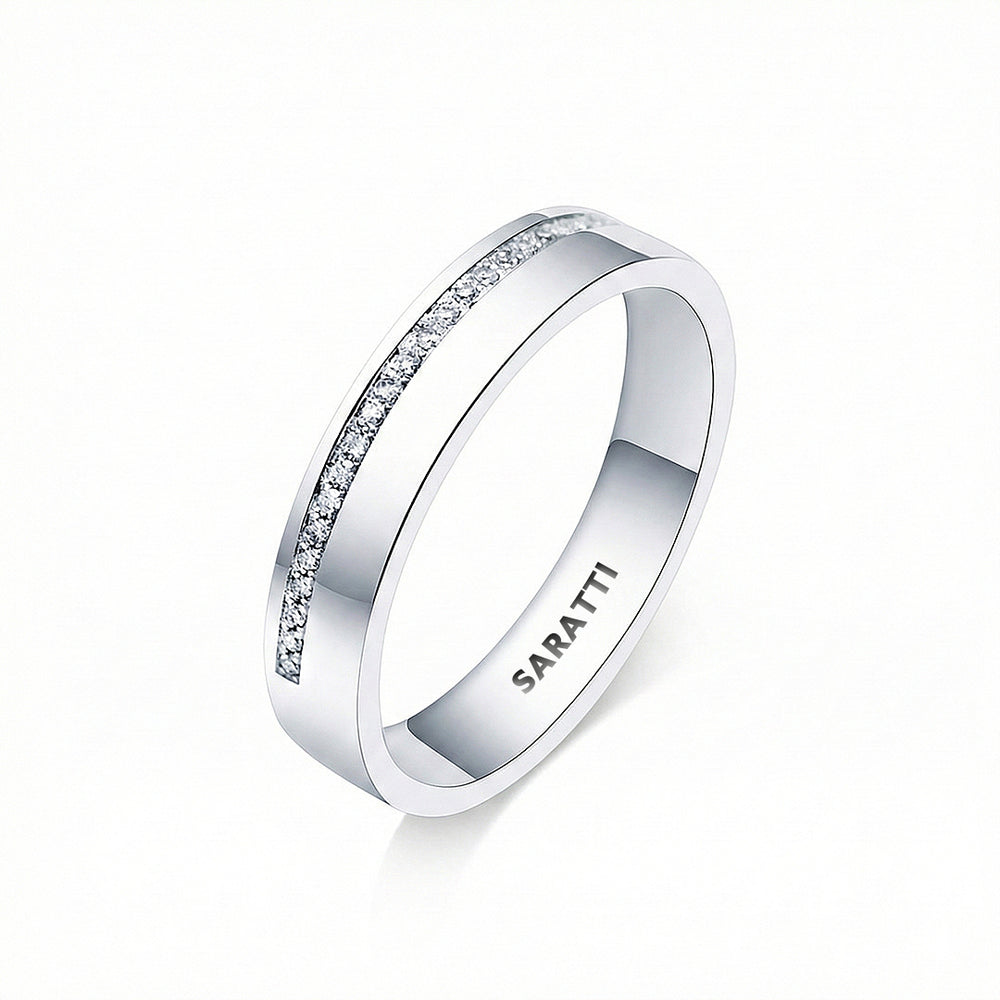 This lovely Diamond Empire Band in White Gold is the bold, classic ring for him. Its minimalist aesthetic with a modern touch makes it uniquely dynamic. It is hand fashioned in solid 18K White gold. The band is encrusted with handpicked bright round natural diamond accents that go halfway through the circumference of the shank.