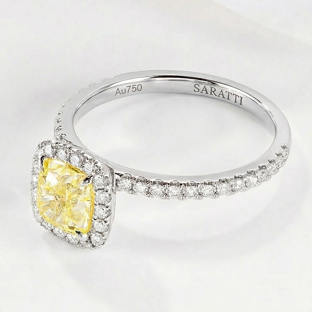 This ring is a celebration of radiance — a 1.25 carat cushion-cut yellow diamond, chosen for its warm, sunlit glow and the way its pillowed silhouette softens every edge. It is a stone that doesn’t simply sparkle — it glows, as if lit from within.