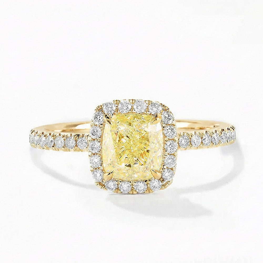 Four delicate prongs in yellow gold cradle the center diamond, allowing light to reach every facet while remaining nearly invisible. Around it, a halo of fine white diamonds creates a gentle shimmer that lifts the yellow diamond forward, intensifying its fire without overpowering it.