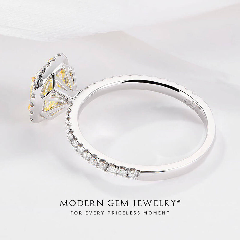 This enhances its natural brilliance and fire. The yellow diamond is encircled by a halo of small, round colorless diamonds. These are micro pave-set to create a continuous line of sparkle that affects the impact of the center stone.