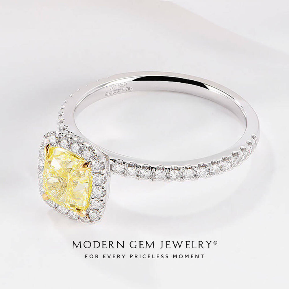 Cushion Cut Fancy Yellow Diamond Ring - 18K White Gold【Made To Order】 is backordered and will ship as soon as it is back in stock.