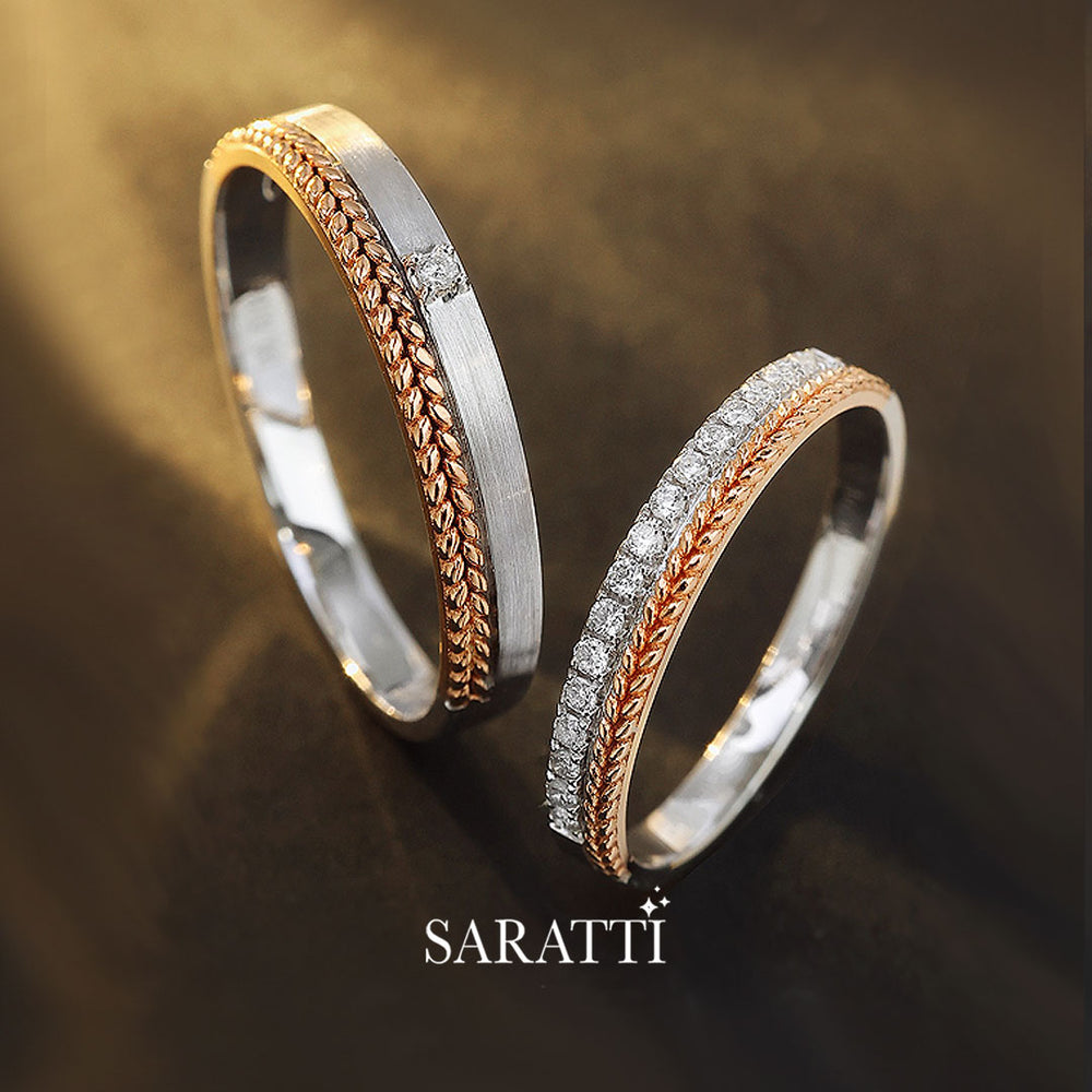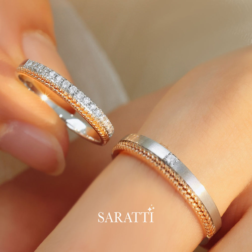 The bride’s ring showcases a row of sparkling natural diamonds set in 18K white gold. This creates a path of brilliance across the band. The ring is beautifully bordered by a delicate rose gold wheat pattern detail, adding a touch of vintage romance to this modern design. The combination of the brilliance of the diamonds with the warmth of rose gold creates a stunning balance of luxury.
