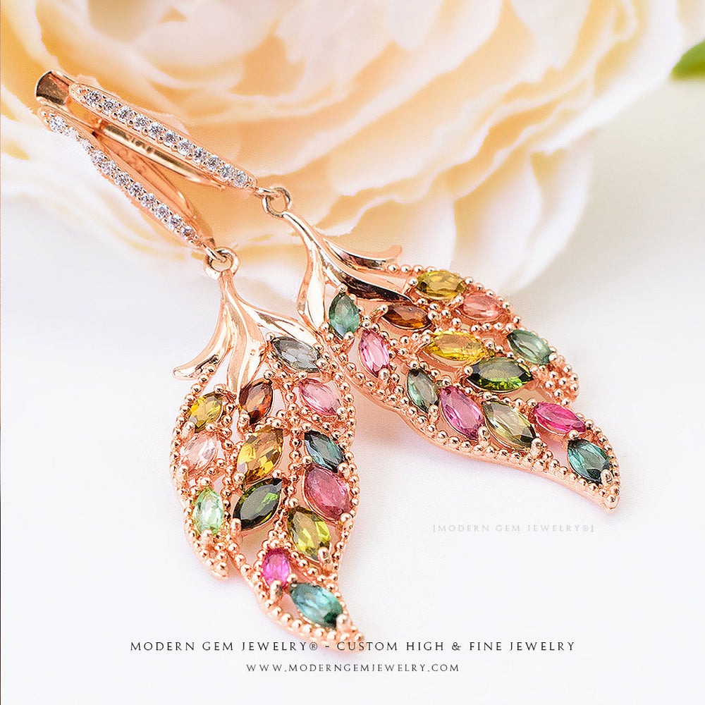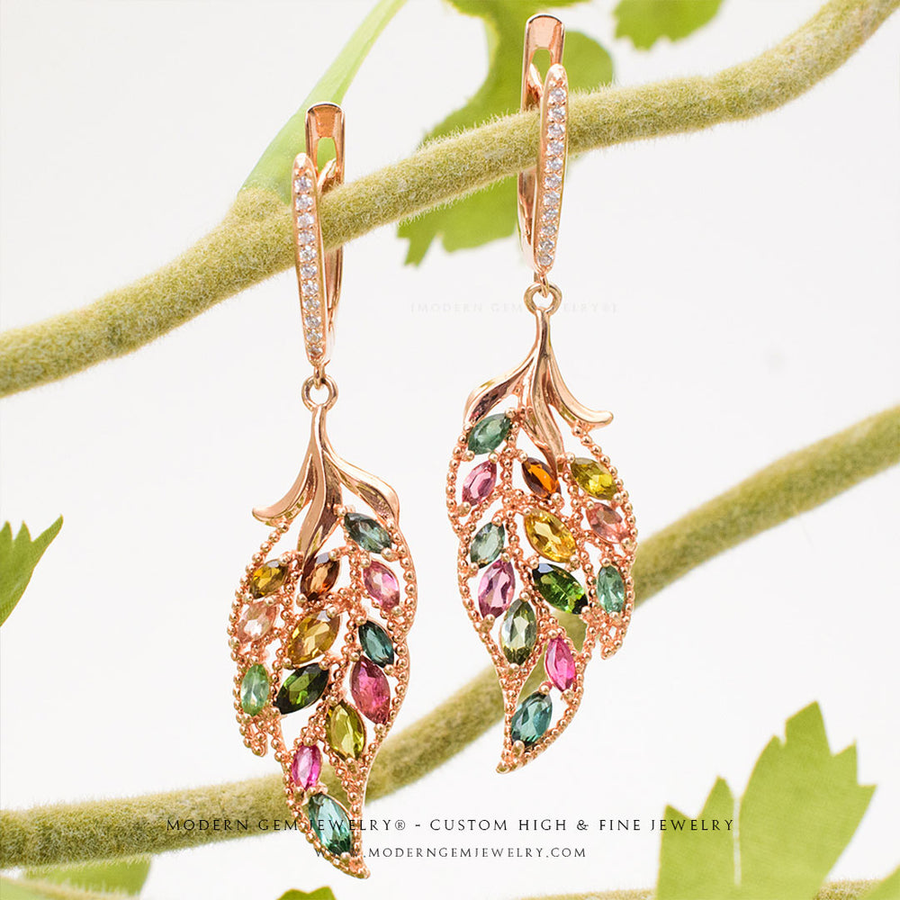 These enchanted leaf tourmaline earrings is a lovely fusion of exquisite craftsmanship and nature's beauty. Handcrafted in warm 18K rose gold, these delicate leaf-shaped earrings features an array of multi-colored tourmalines that invoke the rich tones of a forest in fall. each marquise-cut gemstone is artfully arranged to create a captivating play of colors, from light pinks to sunny yellows to vivid greens and deep browns.
