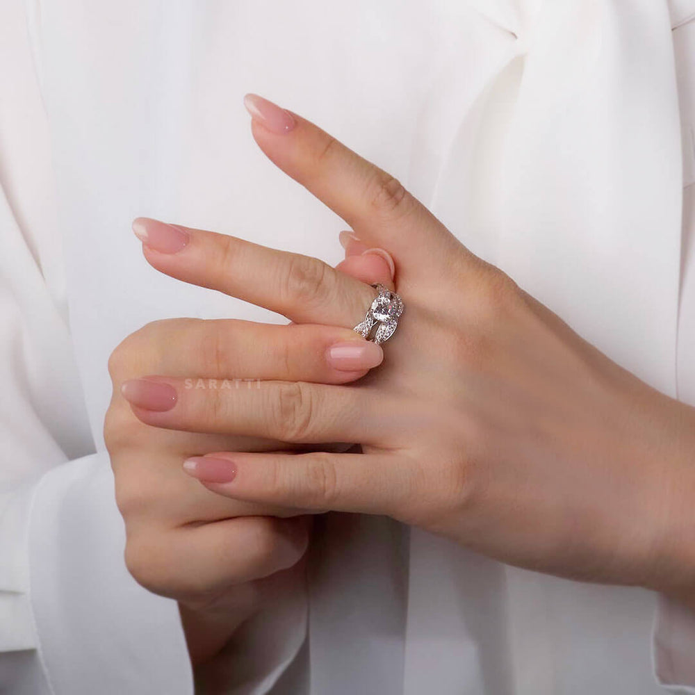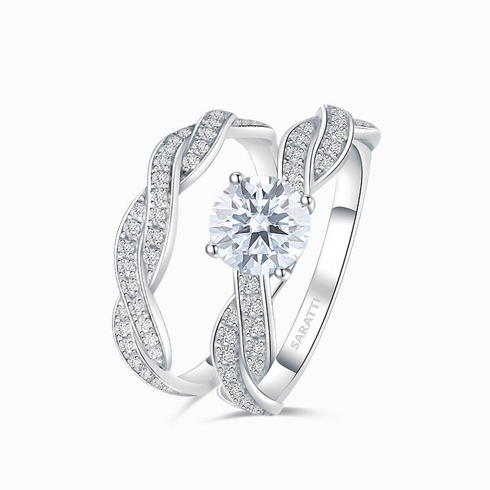 The band itself is noteworthy. It is set in 18K white gold and resembles two ribbons interlocked in an eternal embrace. These twisted strands are encrusted with a total of 0.39 carats of accent natural diamonds. The effect is captivating - as though stardust streams have been woven into metal. The matching wedding band continues this ethereal design. It boasts an extra 0.30 carats of natural diamonds that mirror the flowing lines of the ring.