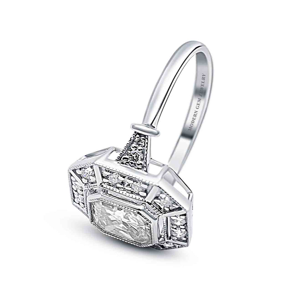 Clara’s setting is an artwork. The octagonal shape is emphasized further by stepped geometric sections. Each of these sections are accented with petite round diamonds that go along down the shoulders of the ring. This geometric approach gives her a unique Art Deco touch, linking two jewelry eras into one classic piece.