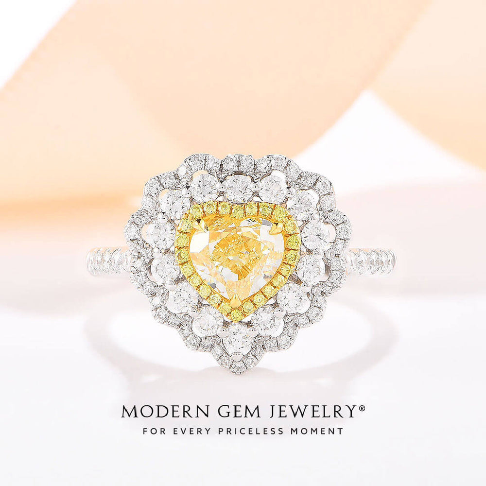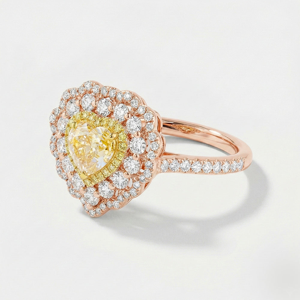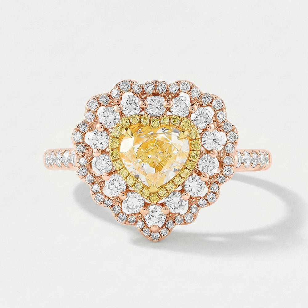 The first halo features intense yellow diamonds that echo the gleam of the center tone. This is followed by two outer halos of colorless diamonds, their icy sparkle providing a great contrast to the heart of gold.