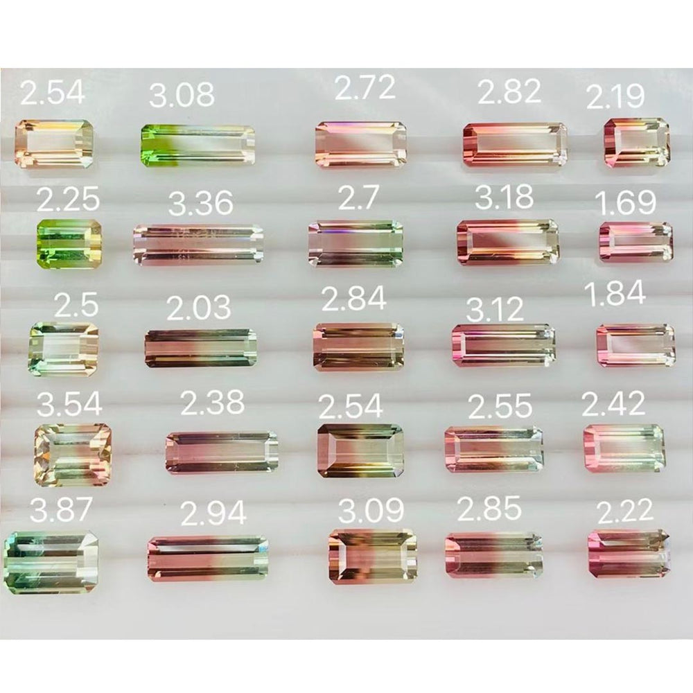 Behold a stunning collection of bi-color tourmaline gemstones that are a treasure trove of nature's artistry. These gems, ranging from 1.8 to 3.8 carat, tells its own unique color, showcasing the alluring bi-color phenomenon that makes the tourmaline such a favorite among gemstone collectors and jewelry designers alike.