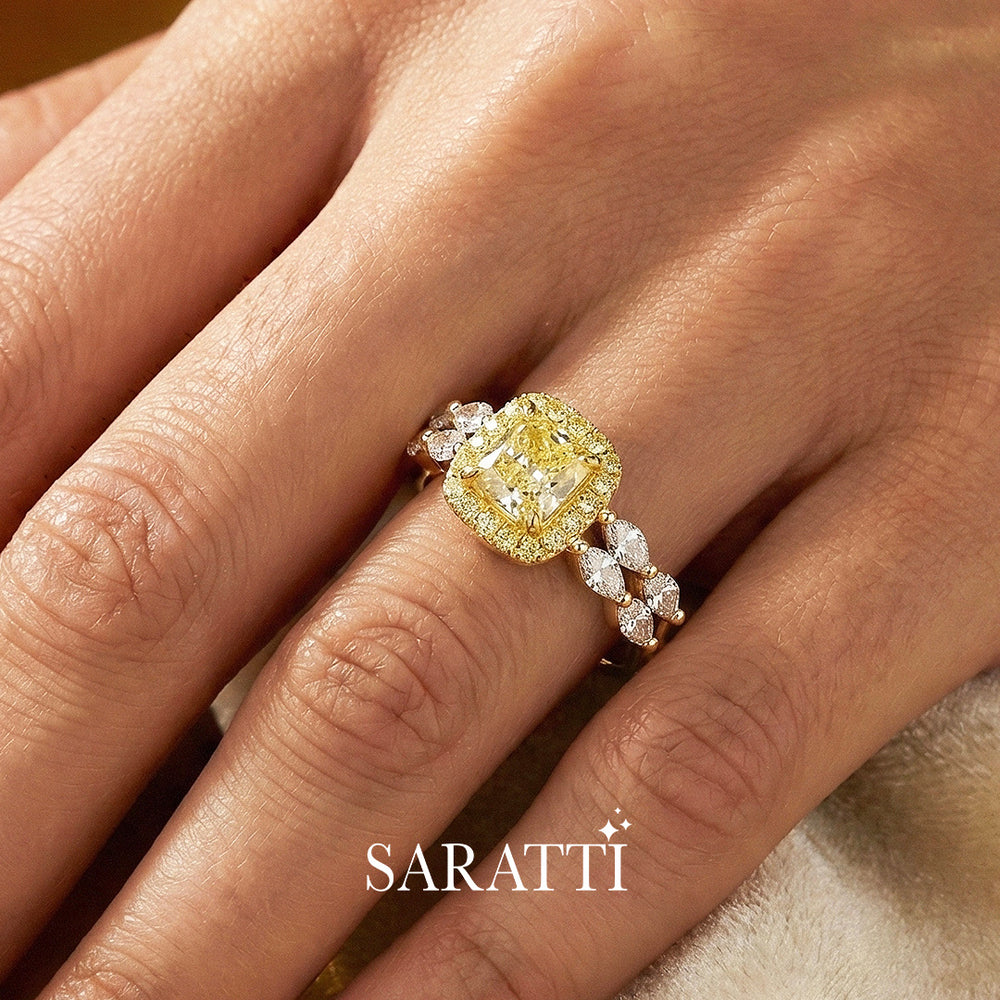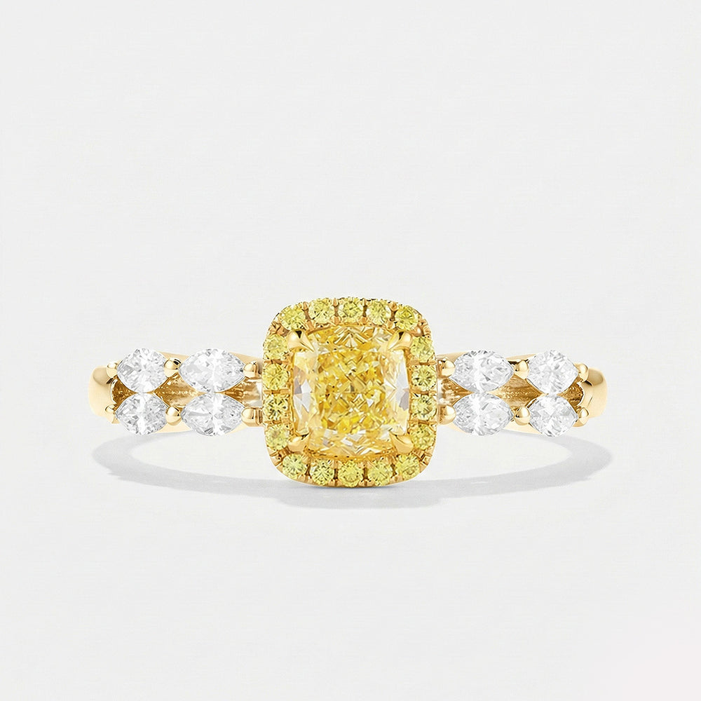 The ring’s band features a design with marquise-cut colorless diamonds gracefully set halfway around. IT has four marquise diamonds on each side, this arrangement adds a touch of classic charm and a beautiful contrast to the yellow diamonds.