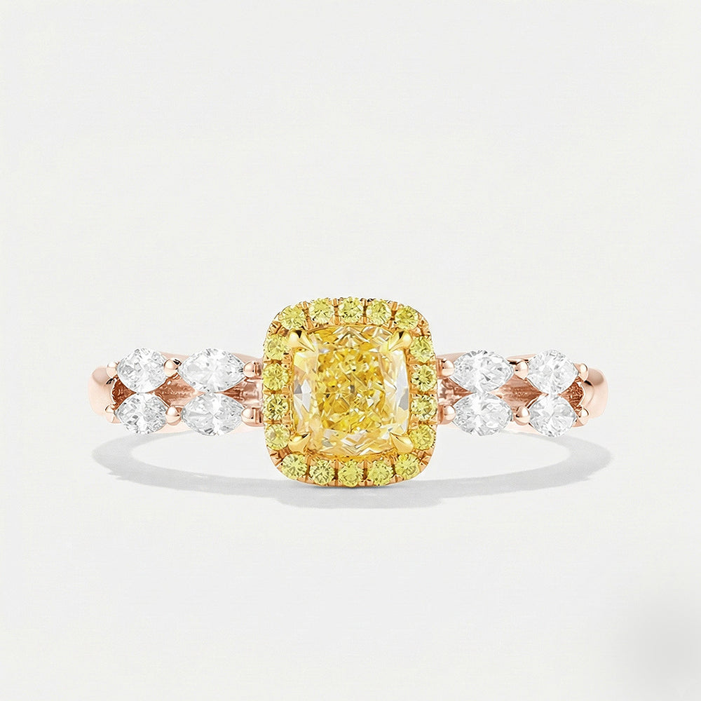 The use of the prong setting for both the halo and center stone ensures ultimate light reflection. The juxtaposition of colorless diamonds and fancy yellow diamonds creates a beautiful balance, making this piece truly versatile for daily and special occasions.